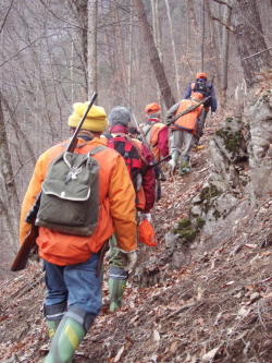 私の住んでいる地域の今期最後の広域有害駆除が27日にありました。結果は初回(昨年12月)にニホンジカ26頭、前回(1月13日)に21頭、今回15頭。近隣市町村が駆除隊を編成して3年目の取り組みですが、毎年、後半になるほど捕殺数は減ります。今猟期もあと2週間、残された猟期はそれぞれの猟友会、グループごとに猟を行うことになります。 で、(写真)は今回私が班分けされたタツマへ向かうメンバーの一部。先頭はこの保護区の地元の案内人、2番目が勢子です。5人ともライフルで、この後稜線へ出て、谷を囲み、イヌを入れました。私はというと、尾根へ出る前の分岐に立ち、谷底の沢にいる人たちとの中間に付くいわゆる中タツの1人。「来る時は尾根沿いに群で来る」と言われましたが、どうみても捨てタツっぽいところで、大汗かいて8合目まで登った割りには―というところ。私も含めて中タツに入った数人は、稜線組と谷底組の銃声をただただ聞くばかリでした。 さて、実際に仕留めたのは沢底で3頭、谷で1頭と私の班では計4頭でした。沢底で顔見知りのハンターの言うことに、「ライフルも弾代上がってなあ、1発350円よ。もったいないからあまり撃たなんだ」って嫌味かよ。しかし私の弾、ライフル弾と同じ値段なんて、やっぱ高い(泣。