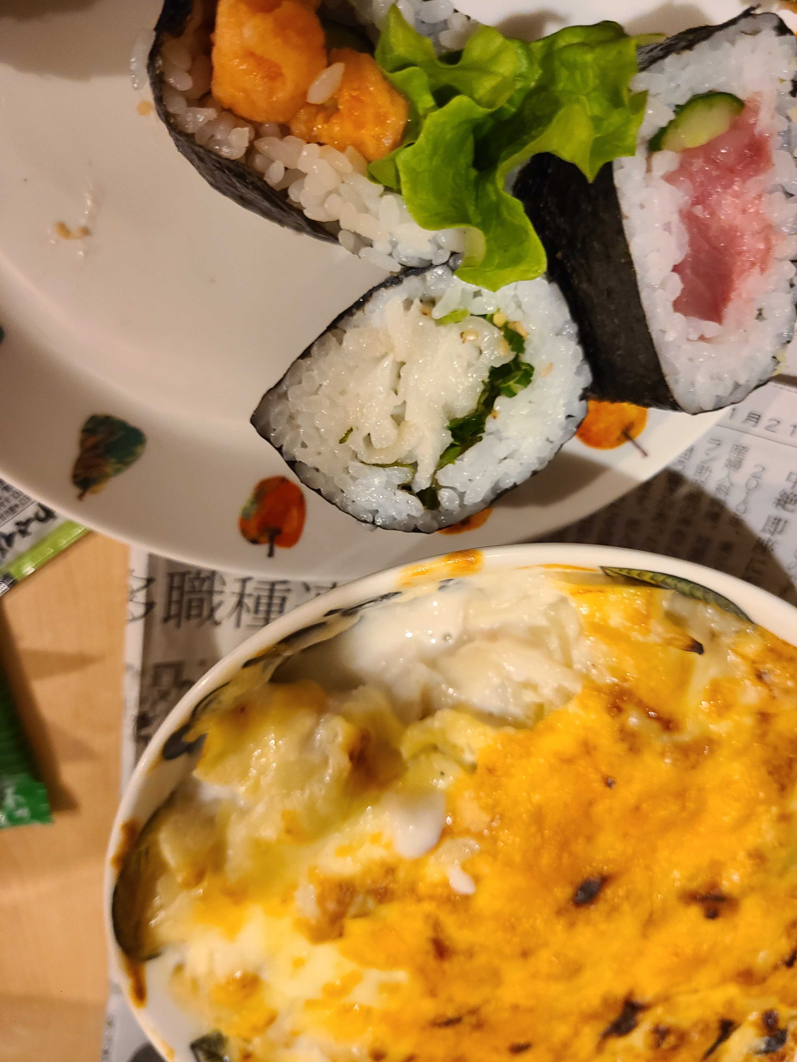 こんばんは🌙😃❗今日も午前中は結構な寒さ🌁⛄🌁さすが👹節分、鬼も凍ってしまいそう🥶🧊氷鬼…なんて🤣幼稚園📛小学生時代🎒を思い出すなー😌豆。買ってきたけど、豆まきなんてやる様子なし。💧そこは、中学生かな。近年はアラナイ母呼んで、一緒に食べてたんだけど。来年は、また一緒に食べられるかなぁ。😌💕今日は、奮発して予約してた恵方巻きに鱈グラタン。お総菜サラダに残り物おでん🍢😁結構豪華豪華✨⬇娘盛り付け。娘、まぐろたたき、私はえんがわ、夫ちゃんの好きなしめさばは今年から売ってなかった。💦たぶん、売れないんだろうな。(..)ちびまるこちゃんのおじぃちゃんみたいに、お金💰️気にしてしめさばばっかり食べる人、そんなにいないだろうからね。夫ちゃんは、単に好きなだけだけど。😅ちなみに、いか、納豆、しめさば、青魚と夫ちゃんは経済的に出来ています。😊その分、娘が中とろなどで経済的に圧迫、エンゲル係数高くしてます😰アラナイ母、もしや転院先決まらないかもー😨と思っていたら、意外と早く決まった。😌\(^-^)/更に、ケアマネも。😃✌️順調、順調。ま、その1ヶ月の間に準備しないとね。💧で、週2.3はリハビリ行ってちょっとでも歩けるようになったらドライブ🎶🚗💨🎶温泉♨️連れて行きたいな。何ヵ月かかるか、何年かかるか分からないけどね。介護が必要になると見えてきた。温泉は、やっぱり数歩でも歩けないとむりなんだなって。😰介護施設みたいな浴用車イス('_'?)やストレッチャーなんかないしね。(((^^;)隣町に数年前にできた温泉施設は、スロープなんかがあって中々よさそうだとのこと。まずは、下見に。って、コロナ何とかならないかなー😓日帰りでもいい、♨️温泉に行かせて欲しい。😌わんぱくでもいい、逞しく育って欲しい。なーんか、似てませんか(-ω- ?)😁似てない、似てない("⌒∇⌒")今日は結局まめまきせず。だーれも開けもしなかった。😓明日、たーべよ💕いつのまにか恵方巻メインなんだよね、まめまきは、二の次。💧何だか、寒いせいかすぐに眠くなりまする。では、皆さん今日も1日お疲れ様でした😌💓豆と恵方巻き、よく噛んで食べて下さいね。では、夢の中へ。😪お休みなさい😌🌃💤
