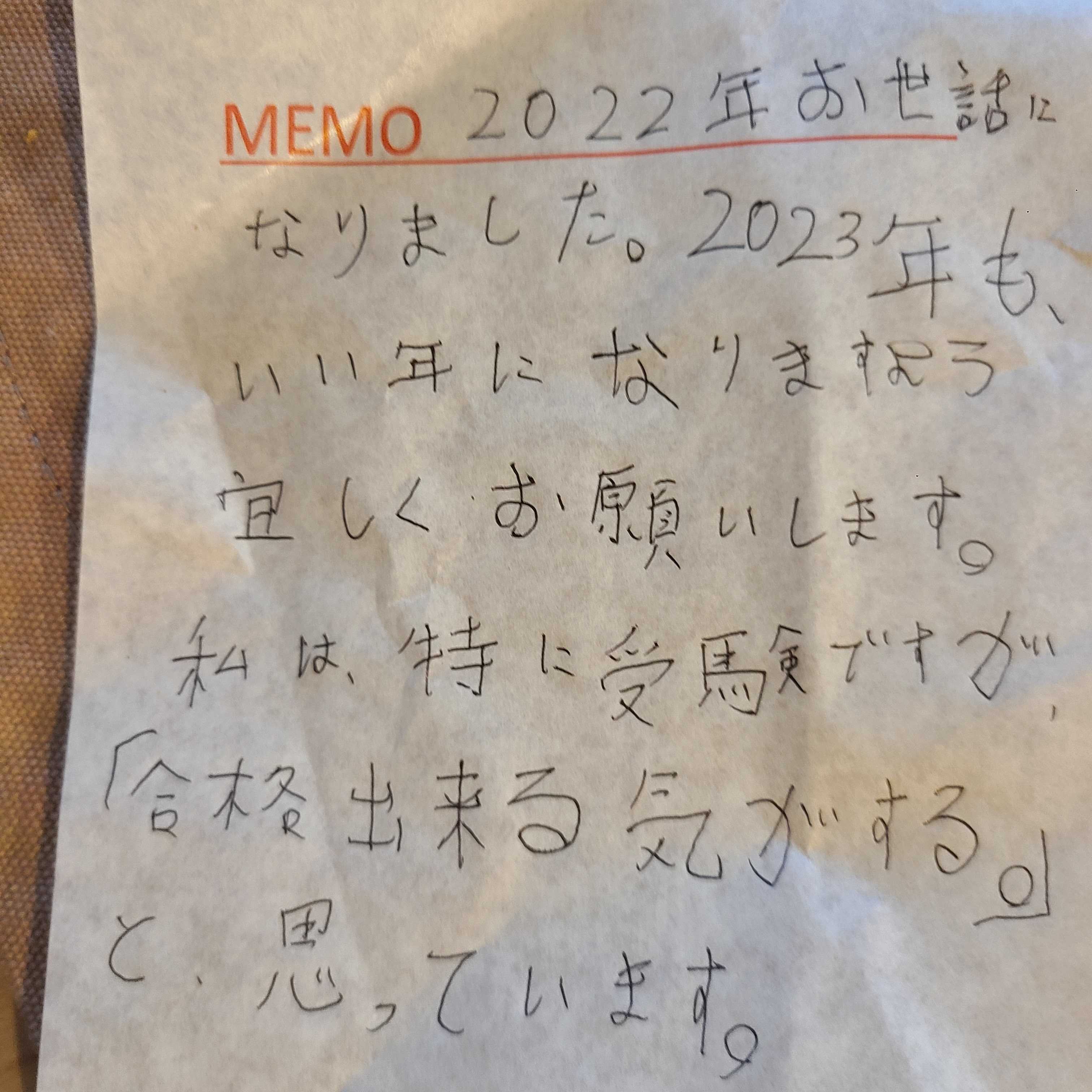 こんばんは🌙😃❗今日は晴れ🌞時々雪⛄昨日の元旦に、娘何か書いていた。何かと思ったら、一応抱負らしい。(渡された😅)この自信満々が、どこからくるのかわからない🤷が😅落ちても、頑張ればいい、と言ってある。結果は、どちらでも。◯◯ちゃんが悪いわけではない、その時の受ける人数や学校側の都合だから、と療育の先生にも言われた。自己肯定感は大切。けど、自信過剰は、どうしたら(-ω- ?)ま、いっか😅話は変わり一年前… 元旦、うちにきた母が寝ていた。2日 母が、具合悪くはないと言うのでじゃ、初詣に行こうと誘うが、行かなくていい、と話すので、初詣神社近くの母宅に置いて、初詣と初売りに行き、三時間後に迎えに行った。すると、椅子に座って動かず両足がゾウ🐘の足のように、いつもの三倍、四倍に腫れて赤紫になっていた。😰 中々、みてくれる病院みつからず。 夕食も結局食べず、水分も摂らないため救急車を呼んだ。7時過ぎだったかと思うが、救急車🚑️到着。 私も救急車に同乗した。 すぐに、急患室にて検査、病室に上がり入院手続き。 先生からの話を聞いて帰るのだが、先生中々来ず。やっと10時過ぎ。 娘寝てしまっていて、夫ちゃん、一人で迎えに来てもらい、帰宅🏠️🚗💨 なが~いお正月の1日だった。😰この日ほど、救急車🚑️のありがたみを感じた日はなかった。救急隊員の皆さんありがとう❤️今年は、一応皆元気で、アラナイ母も遠方にて一応元気らしい。家族の元気が一番。今年も、私の病気も治り、皆元気に暮らせませように🙏✨アーメン初詣は、神社に行って来ました😆💦✨昨日届いた年賀状。二年だけ、しかも数回だけしか話をしなかったけれど、娘を交流学級に行かせてくれた校長先生から。✨◯さんを思うお母さんの頑張り、立派でした✨と書かれてあった。🥺何とかしたいと、必死だっただけで、怒りを先生にぶつけたのに。よく、聞いてくれたなぁ✨校長先生こそ、まるで仏様みたいに(まだ亡くなってないけど😅)心が広いな~と今思うと感心する。今日は、初売り?初詣?うちは、近所の比較的人の少ない初売り2ヶ所と初詣に行きましたよ。🎵大型百貨店もいいけど、近所の店もわるくない。😌今日も1日、お疲れ様でした😌💓のんびり、充実したお正月を✨✨✨お休みなさい😌🌃💤