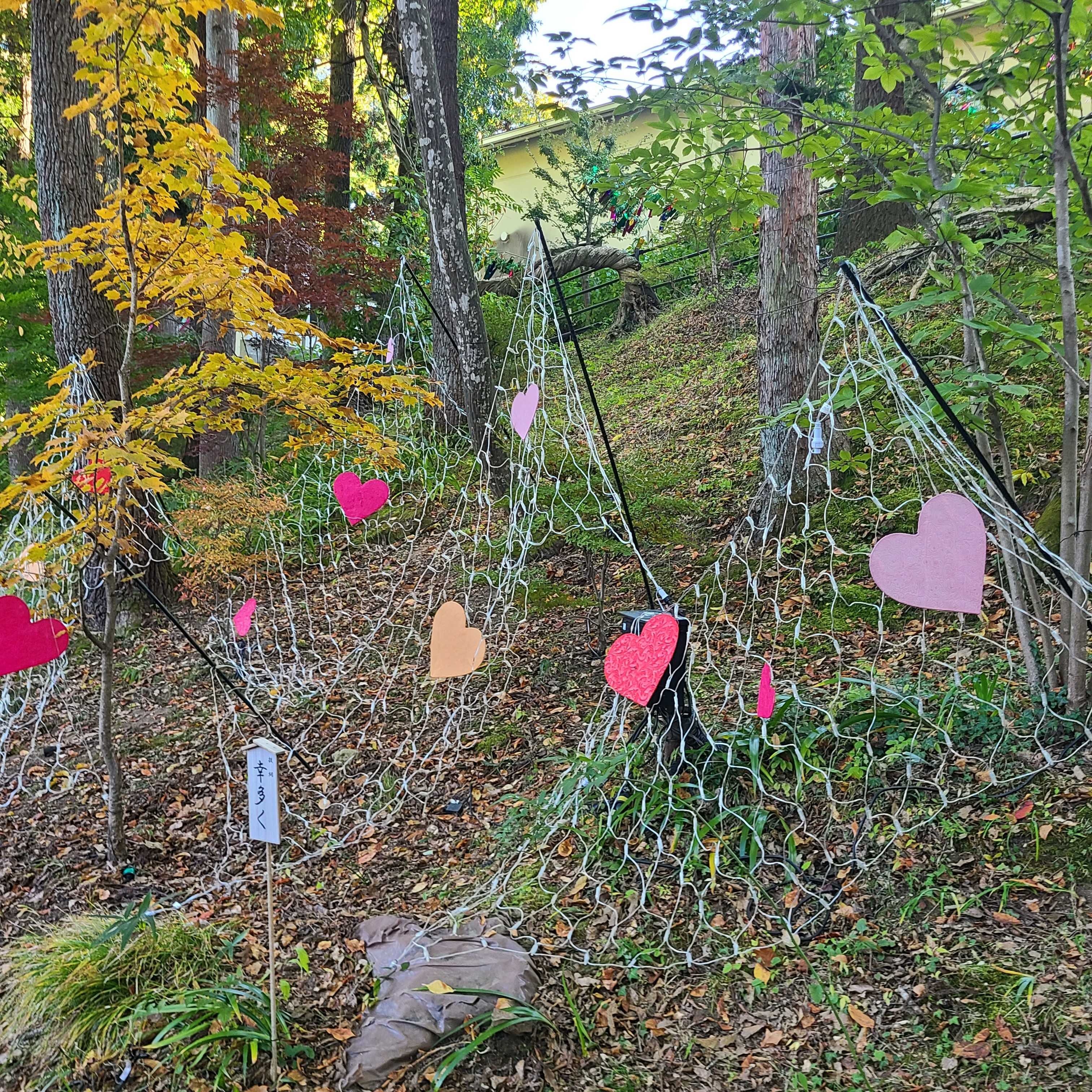 帰りの紅葉狩りで立ち寄ったスポットは、ライトアップも楽しめるってことでなぜかツルや蜘蛛の巣にハートがくっついたオブジェみたいなものがあった 。