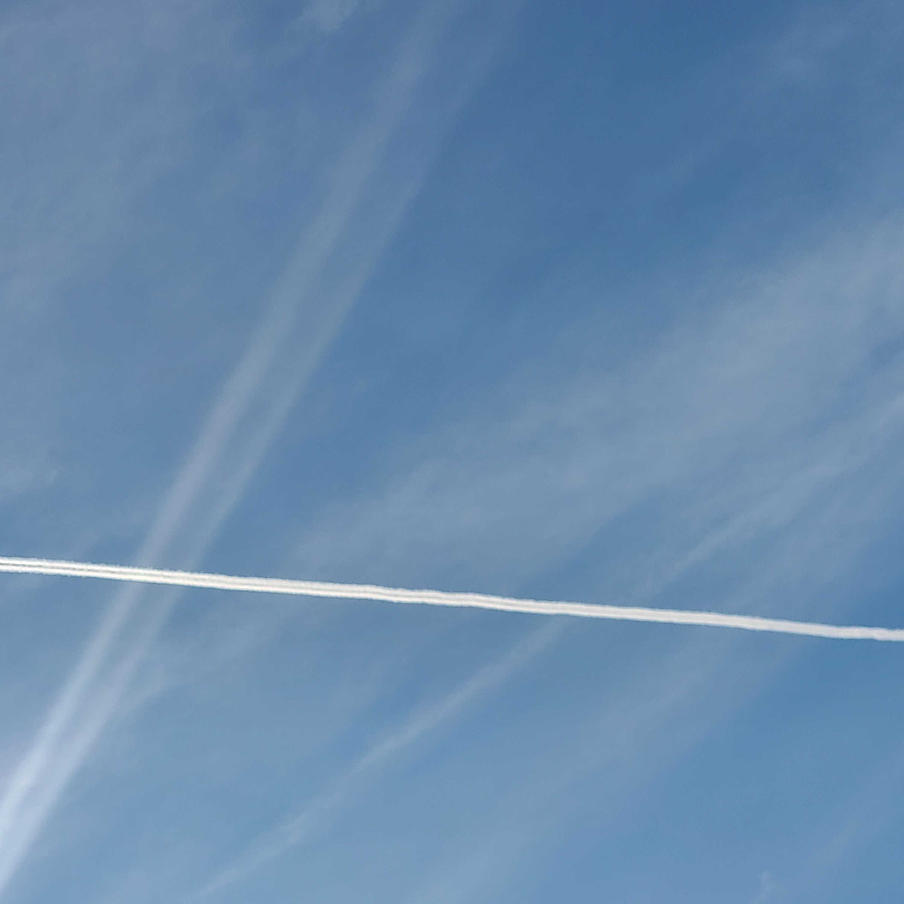 チアを待つ時間、空には飛行機✈️まるで、絵の具で描いたような飛行機雲🎵