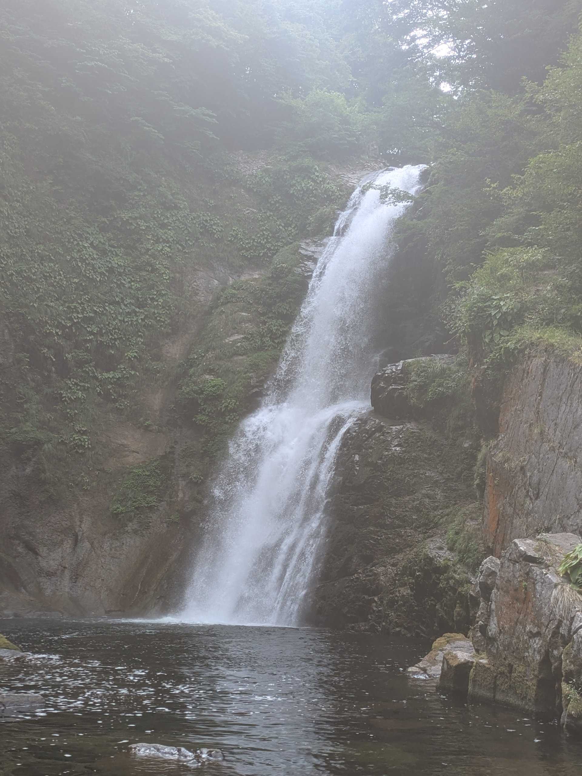 滝つぼ近くまで急な階段を降り、川へ。いやー冷たくて気持ち良かったー。😆