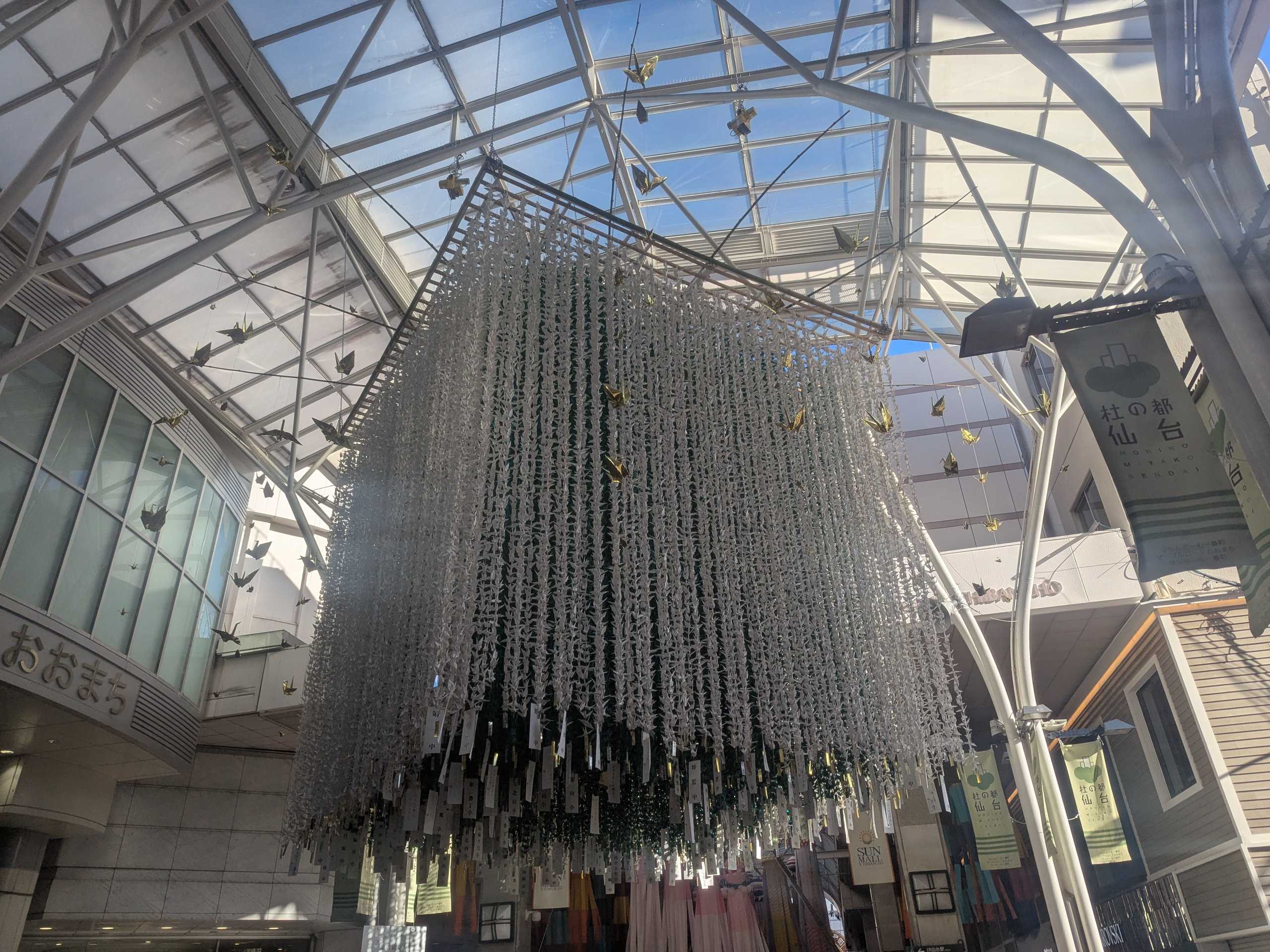 今年も七夕を何とか観に行った。今年は、娘の学校の七夕を…と探して歩き回ったが見つけられず。冷たいもので小休止して戻りながら更に探したが、結局見つけられなかった。💧七夕飾りはだいぶ様変わりした。ちょっと前までは、七夕飾りを暖簾のようによけて進むと、また次の飾りがあり、迷路みたいで楽しさや驚きがあった。今は、見上げる位高いところに飾りがある。皆、上を見上げながら前に進むのでぶつかりそうになったり。以前は、避けるので飾りがとれたり破けたりすることもあって勿体ないなと思っていた。今は、破損することもなく、リサイクルすることも出来る。時代の流れを感じる。見て回ると、平和の願い事が多かった。そして、コロナが一応落ち着いたせいか、飾りの出品が多い。〇〇児童館、〇〇ディサービスもあった。(実は派遣で行ってるディサービスも利用者さん達が作って飾られていた)戦争が終わりますように。平和が続きますように。この何千、何万の折り鶴にはやっぱり平和の願いが込められていると感じられた。地域の何百かの小中学校の生徒達が作った折り鶴。(写真)平和が続いて、ずっとずっと七夕祭りが続きますように。