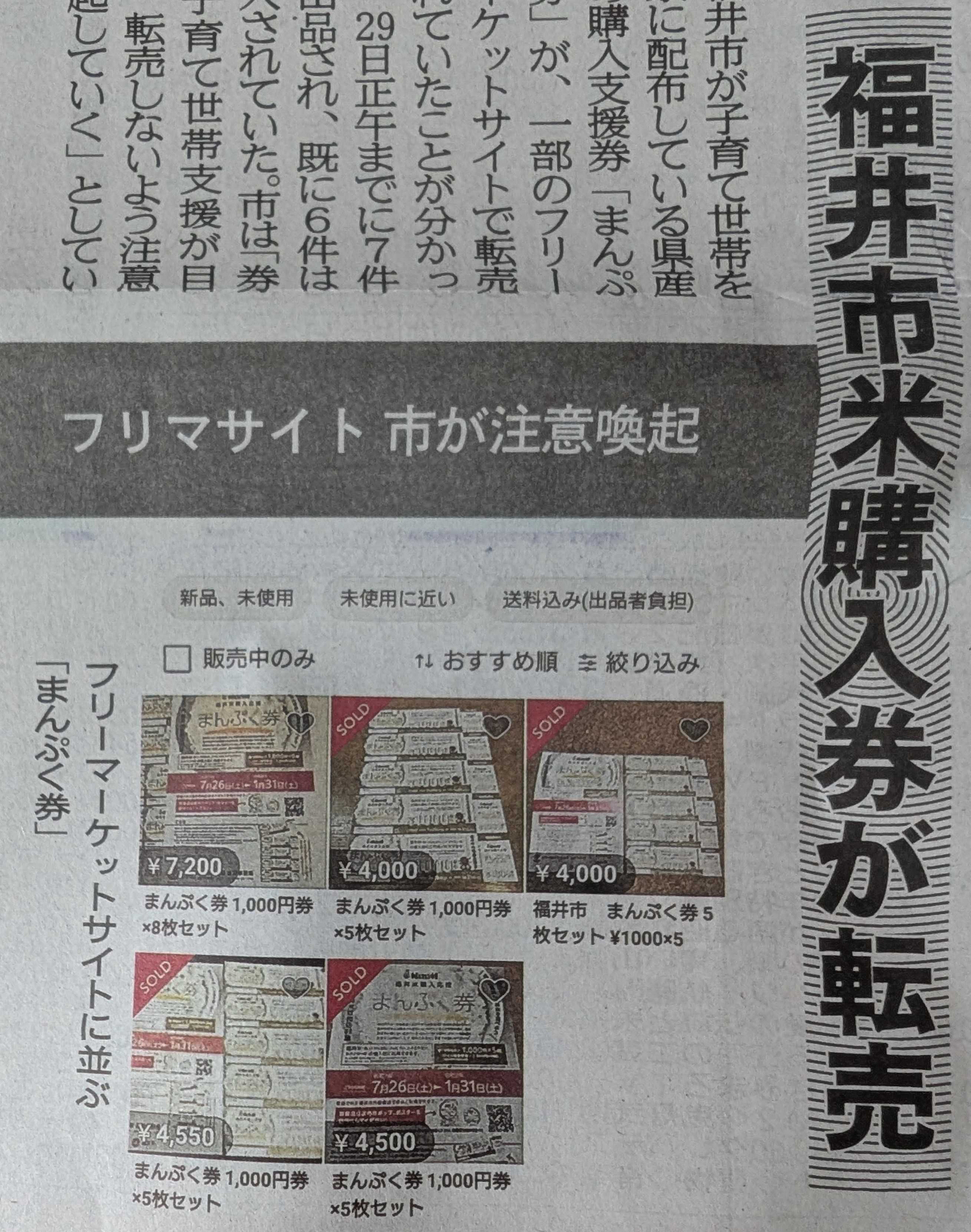 福井では米のまんぷく券を子育て世代に配布しているが、なんとフリマアプリに転売していたという、なんとも腹立たしい事に…😤