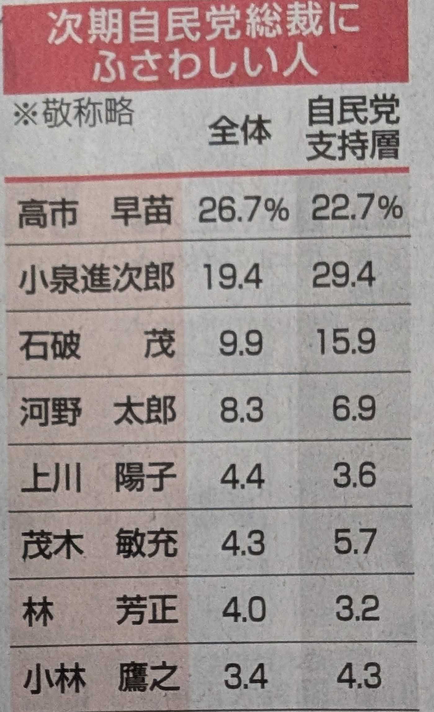 世論は高市早苗さん、自民党内では小泉進次郎さん