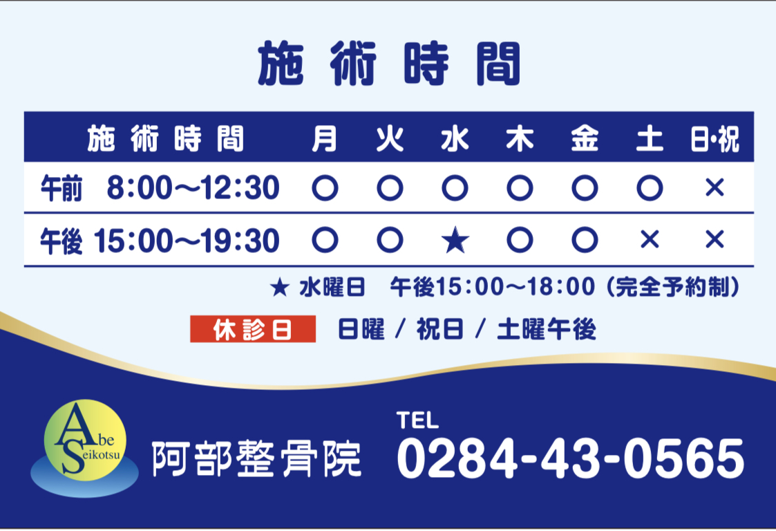 水曜日午後の施術について3時から6時まで予約制です。当日予約も可能ですので、お電話にてご予約をお願い致します。また、緊急の場合にはなるべく優先して対応しますので、ご連絡下さい。#阿部整骨院#足利市#交通事故治療#スポーツ外傷#パーソナルストレッチ