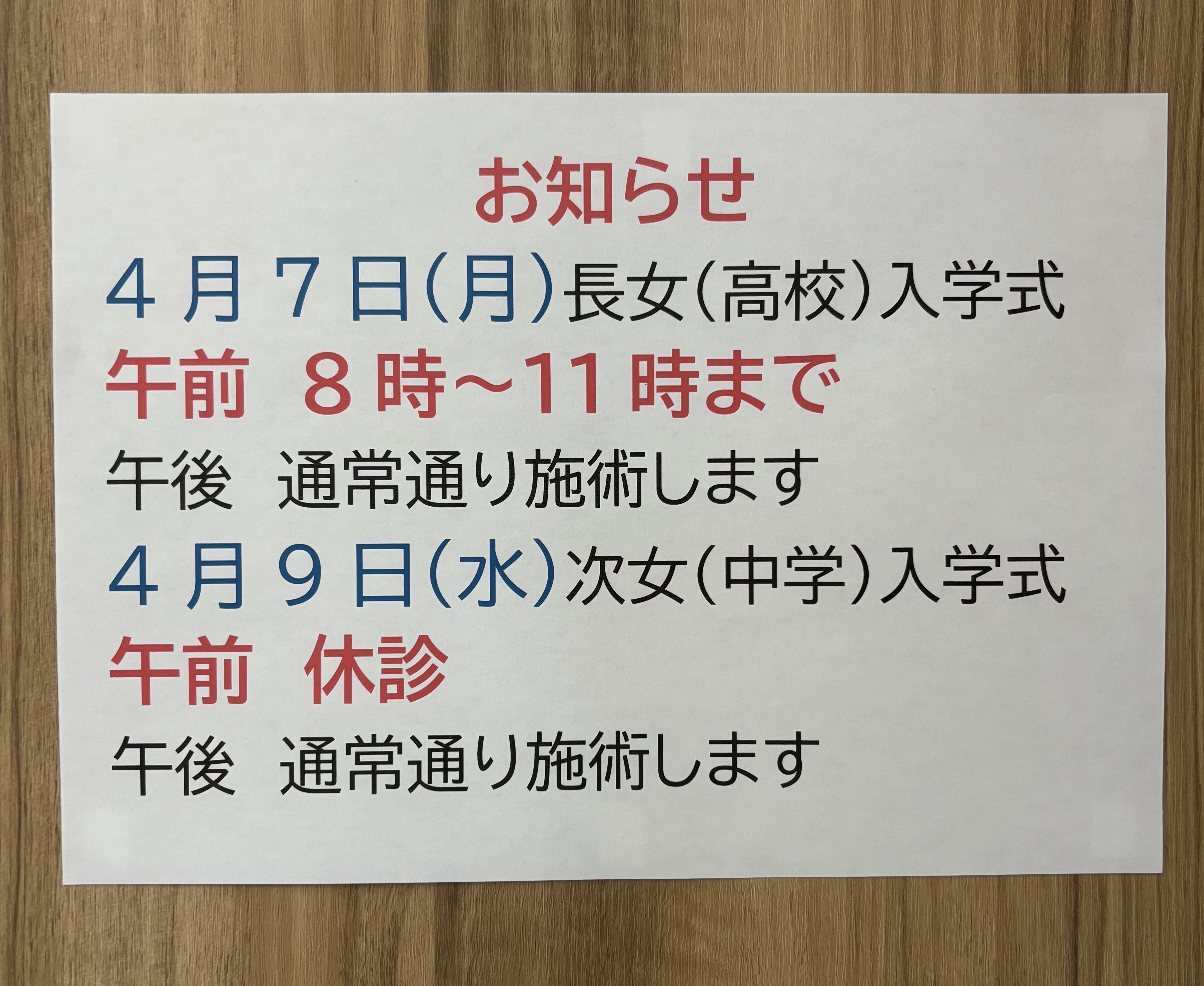 お知らせ7月10日(木)の午後は6:30までの受付です。大変ご迷惑をお掛けします。