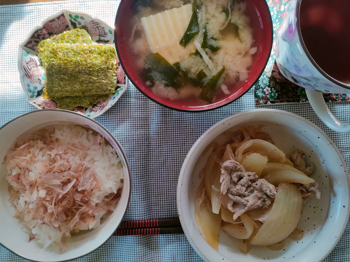 こんにちは~^^こちら知多半島今日は寒い!曇ったり晴れたりですが雪や雨は免れそうです昨日は災い除けと称するものをお寺さんから毎年賜りますそれを玄関に飾るといい!ということでそれの入れ替えや自分の書いた色紙の差し替えといった事をしていました窓の汚れも気になるところ・・・ここはね・・・すぐには取り掛かれない。。そういう気分((+_+))こうしているとこのまま新しい年を迎えそうな気もしていますがね・・・( ;∀;)まぁゆっくりモードの私でございます<m(__)m>今日のお昼は・豚肉と玉ねぎと糸こんにゃくの煮物(水なし・料理酒&味醂&醤油のみ)・味噌汁(豆腐&切り干し大根&ワカメ)・焼き海苔・おかかご飯^^今日も完食^^ごちそうさまでした^^💛いつも習字教室のページのポチ! ↑ (ここをクリックしてページに入ってね<m(__)m>)ありがとうございます<m(__)m>ホームページに行かれましたらこのような所がありますので矢印の『このブログに投票』をポチお願いします<m(__)m>