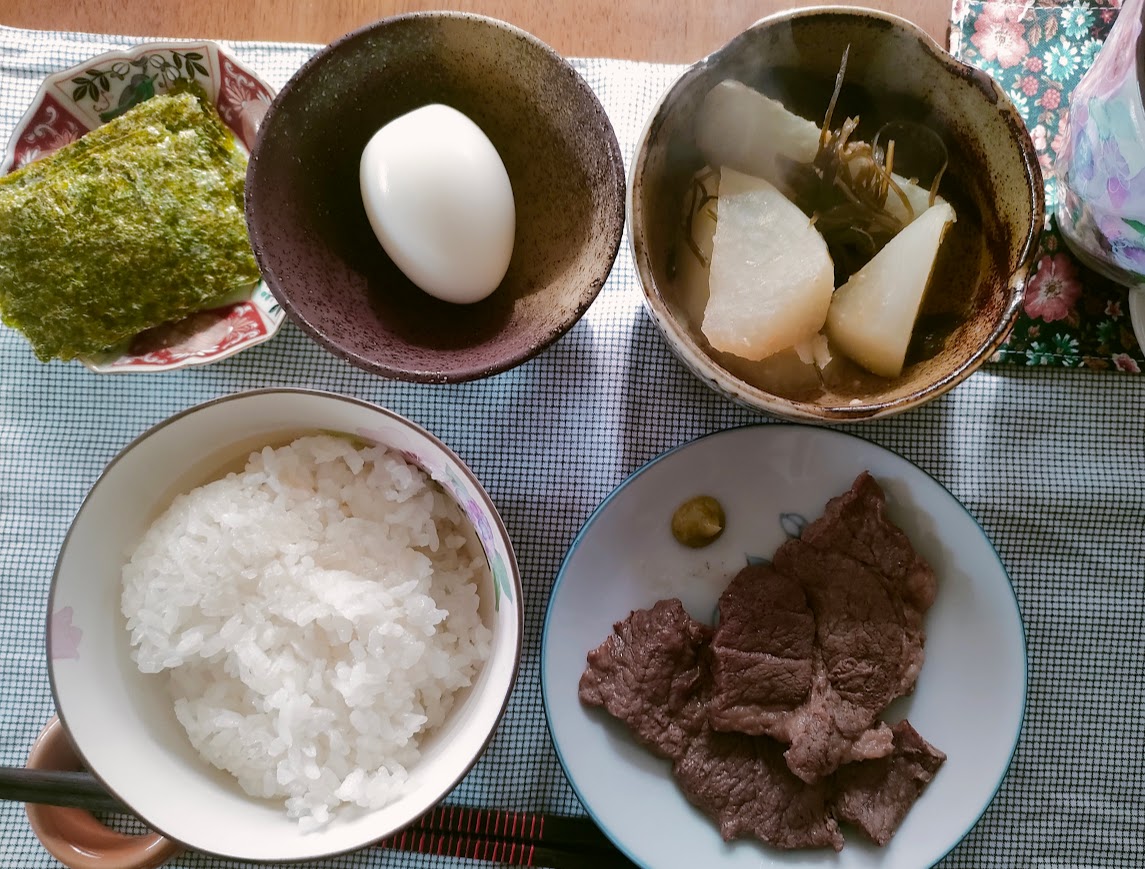 こんにちは~^^こちら知多半島晴れています^^毎日寒くなってきましたね・・身体の調子を崩さぬようにがんばりたいと思っています最近筋肉が落ちちゃった気がしています脚の筋肉・・・腕の周りこれはいけませんよね。。。脚は特に気になります最近食べていない物それは牛肉!!!!今日はそのステーキを食べることにしました^^タンパク質補充します^^そして大根を昆布と合わせ味噌味に煮付けましたあとは定番!!焼き海苔ごはんです^^今日も完食^^ごちそうさまでした^^💛いつも習字教室のページのポチ! ↑ (ここをクリックしてページに入ってね<m(__)m>)ありがとうございます<m(__)m>ホームページに行かれましたらこのような所がありますので矢印の『このブログに投票』をポチお願いします<m(__)m>スマホ版では下の方になるかとお世話になります<m(__)m>