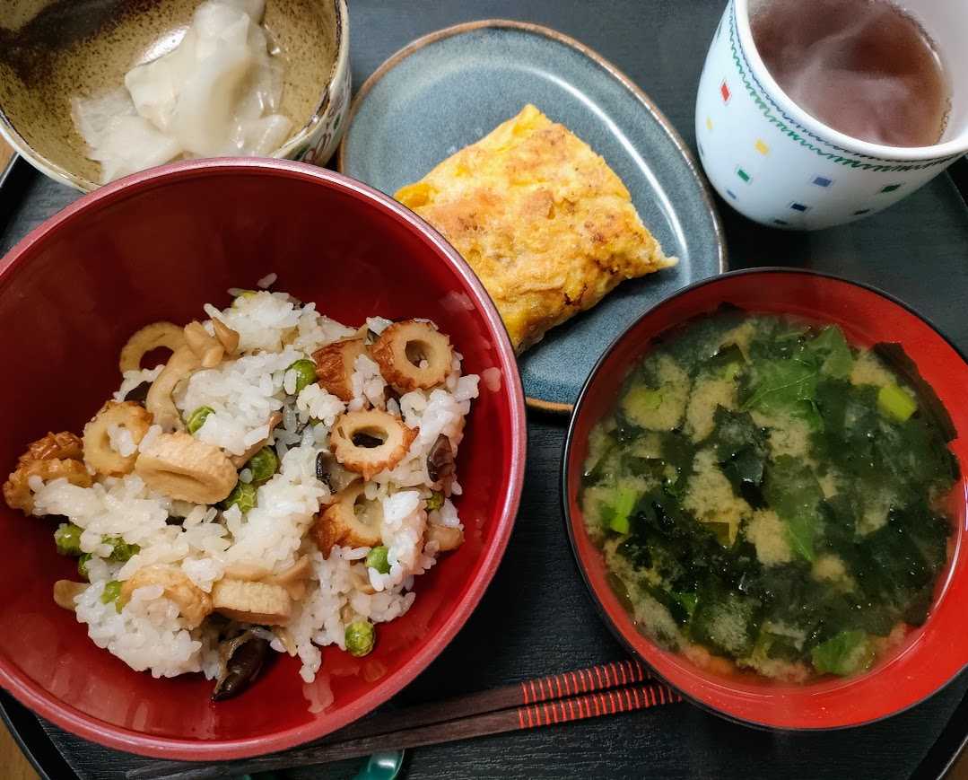 〇 久々 キノコ混ぜご飯^^ (ヒラタケ 竹輪 グリーンピース)