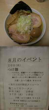 さて、まさか今月イベントがあるとは思わなかった。20日水曜日、つけ麺のイベントがある。つけ汁は、悪魔ラーメンの醤油タレにコラーゲンをブレンドした特製スープだということだ。麺はラーメンと同じだ。大盛と普通盛共に900円。また、毎月恒例の塩こってりだが、明日6日水曜日、塩こってり二作目。27日水曜日、塩こってり一作目。なお13日水曜日から18日月曜日までは夏期休業だ。