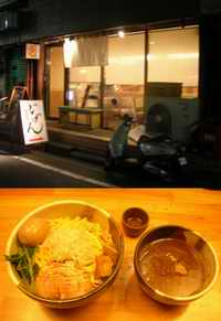7時40分頃に入店したら先客1だ。ちょっと寂しいと思ったらすぐ客が入ってきて、三分の二の席が埋まってしまった。立地がよくないものの、やはり認知されているんだね。濃厚系メニューが売り切れなので、つけ麺大盛、味玉を注文した。麺を平打ち太麺にした。約5分ほど麺を提供した。早すぎると思われるかもしれぬが、太麺とは言え、東池袋大勝軒系よりも細めなものだ。