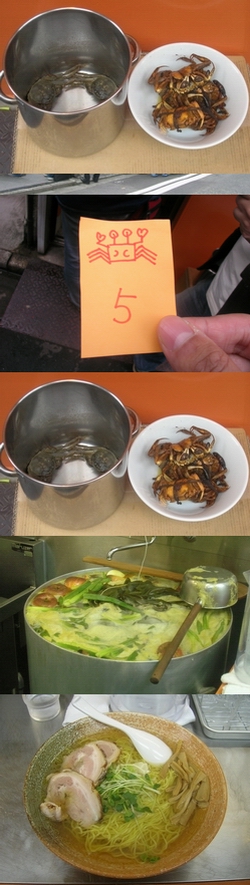 とりあえず到着したら、たけぞうさんも到着したので、ちょっとラーメンの話をしたら、 BUSHさん も到着した。 アミーゴさん も到着した。はじめまして。名前をよく聞かせてもらったが、挨拶するのがはじめてだ。そしてメガネさん、 FIIEさん も到着した。ラーメンの話がますます盛り上がってきた。開店直前に、黒覆面は店を出て、今日の素材である上海蟹を展示した。って、どこのラーメン屋さんも同じことしているような気がするね。