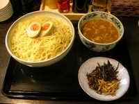 しばし提供したカレーつけ麺はネギの揚げ物が付いている。たぶん薬味としてつけ汁に投入するものであろう。豚肉が入ったつけ汁は辛いほうだ。麺の茹では柔らかいほうだが、結構合う。途中揚げ物を投入すれば、辛さが変化したという感じだ。ただし割りスープを注ぐと、割りスープは薄い味なので、全体的にカレー味だけではなく、スープの味も薄くなった。
