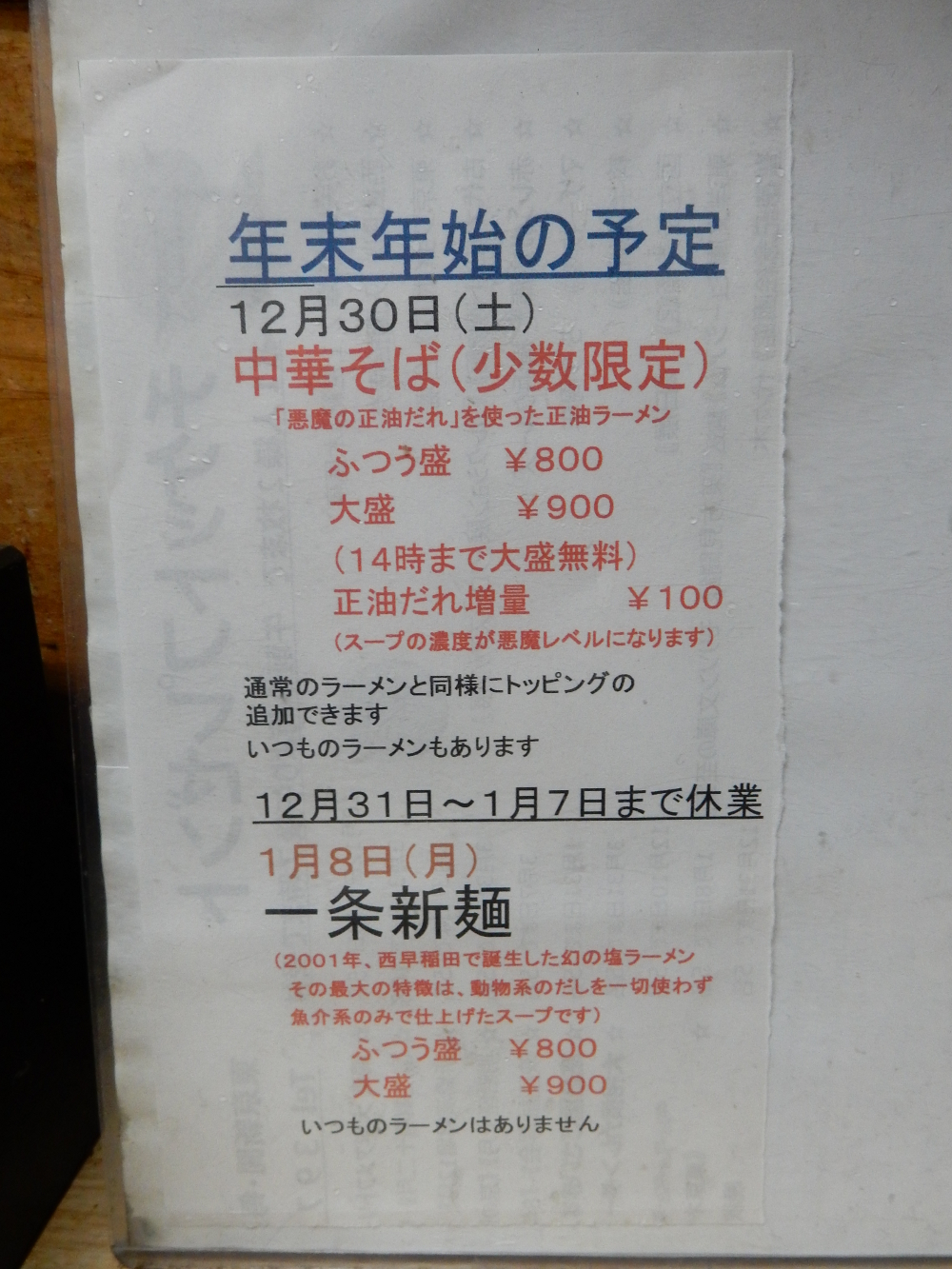 相変わらずおいしかった。年末の限定を食べに来ることができないと思うが、来年の一条新麺を食べに来たいね。