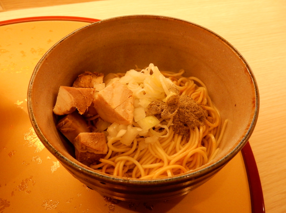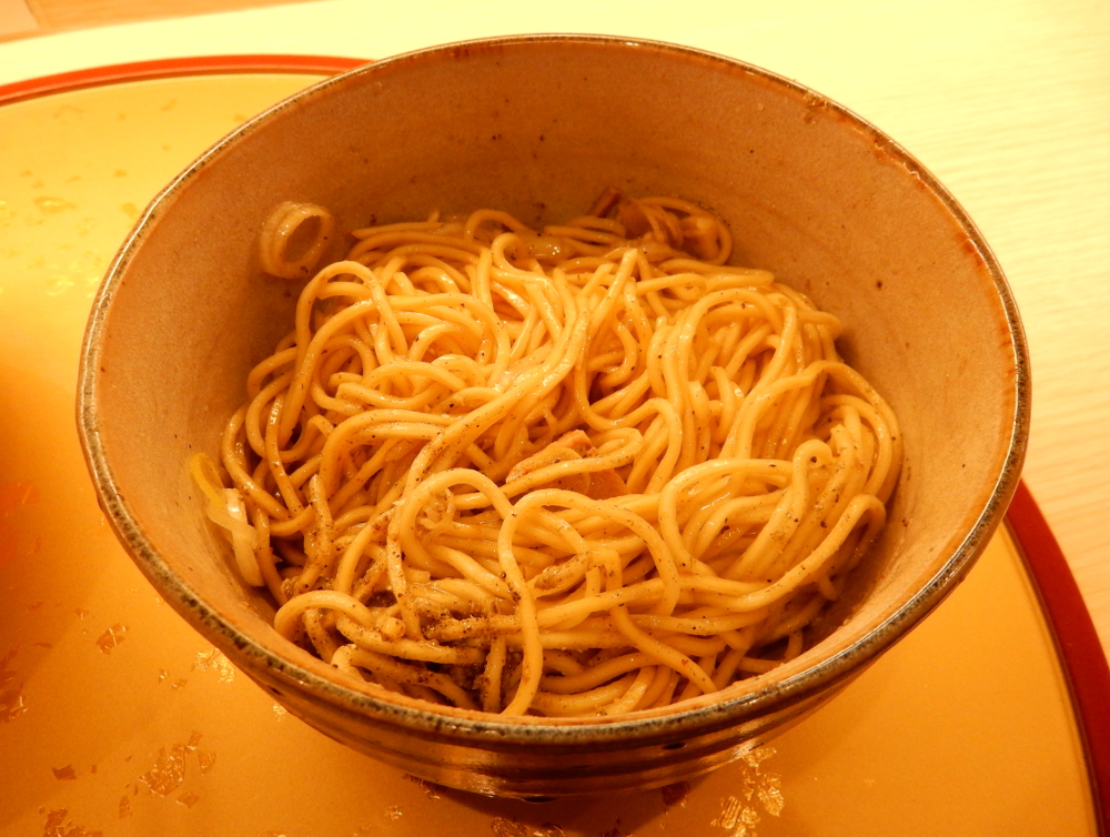 外見はほかのお店の和え玉とはそんなに大差がないが、かき混ぜたら、下に醤油味の煮干しのタレが入っていることがわかった。