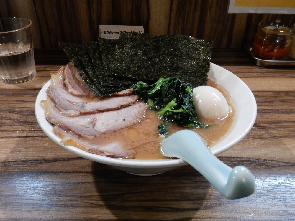 中野五丁目へ少し歩いたら、「​ 五丁目ハウス ​」に到着。立川の有名店「​ つけめん らーめん 青樹 ​」の系列店「つけめん油そば 五丁目煮干し」の跡地にある。五丁目煮干しは閉店したが、店長は店舗を引き継いで家系のお店として独立開店したということだ。全部のせ並盛の食券を購入し、カタメをお願いした。ライスは無料だが、夜なのでなしということにした。