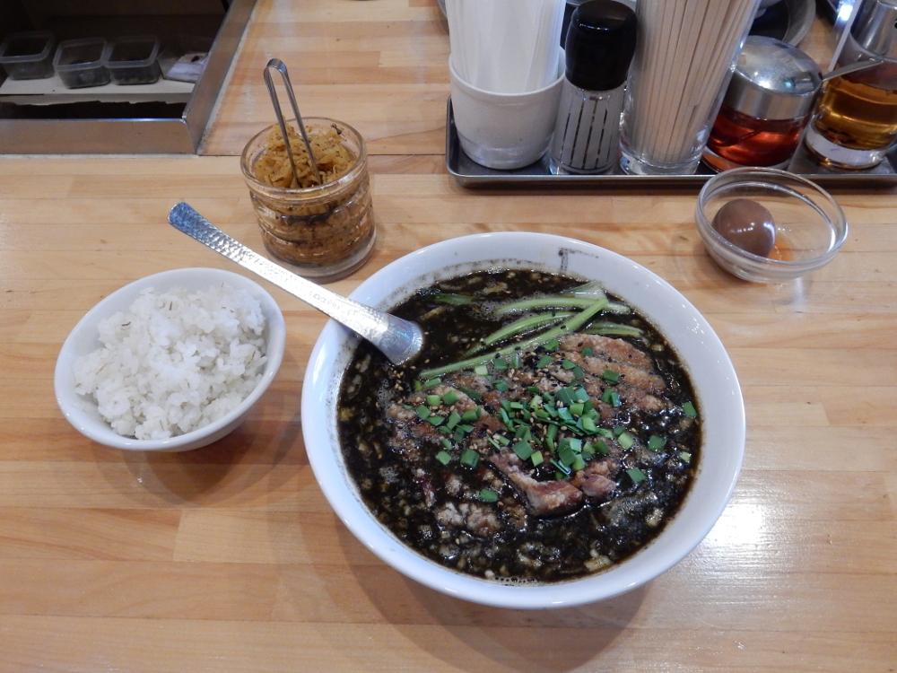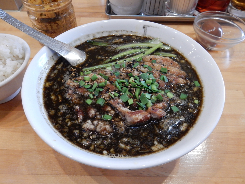 ​ 体調 ​も考えなくてはならないので、自然に「​ 東京担々麺本舗 瀬佐味亭 ​」に入店。ほぼ満席。黒担担パーコーのスーパーホット、麦ご飯を注文し、クーポンでほかほか煮込み茶玉子をお願いした。
