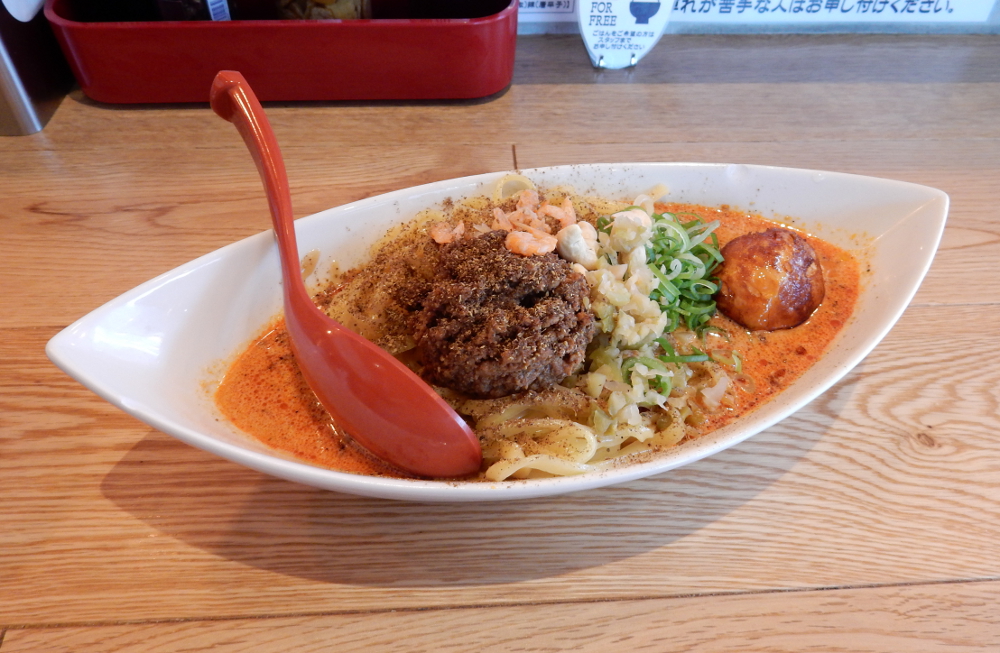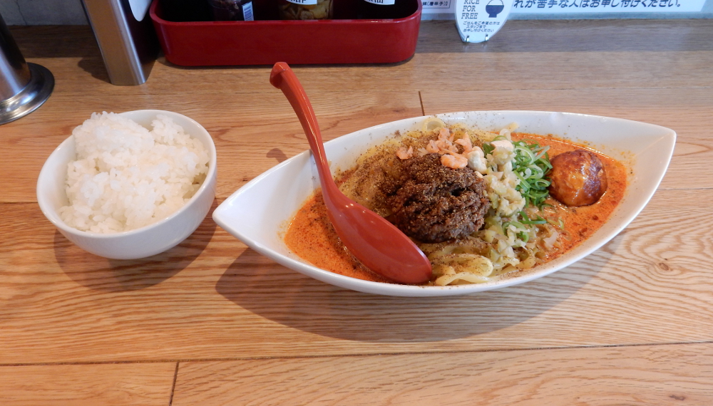 水道橋界隈に通りかかったら、「​ 麺や すする 担担麺 ​」を見た。最近山椒を使う担々麺を提供するお店は都内で流行ってきたが、ここも「​ 麺や すする ​」というお店の支店から担々麺専門店へリニューアルしたという。ちょうど開店時間なので入店し、汁なし担々麺、小麻婆飯、揚げ味付玉子の食券を購入し、4辛とランチタイムサービスのライスをお願いした。