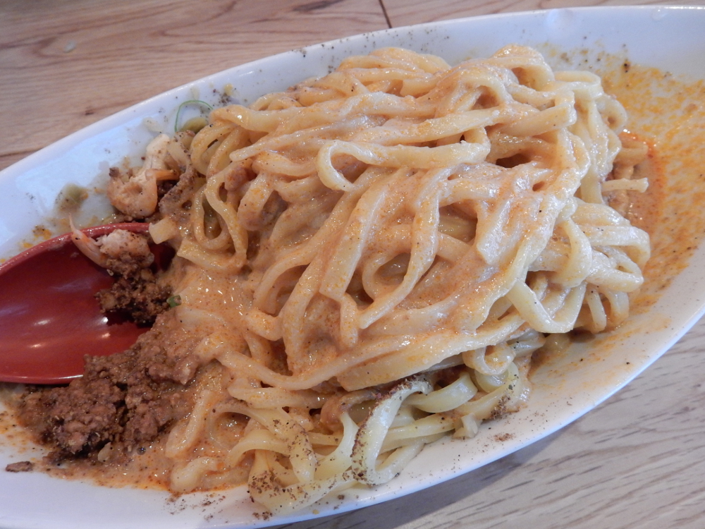 汁なしと言っても、ゴマタレがかなり多くて、汁ありのようにも見えるね。肉味噌も多そうだ。