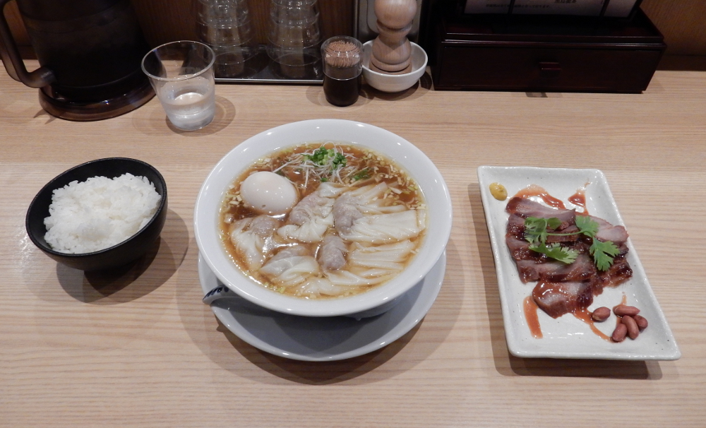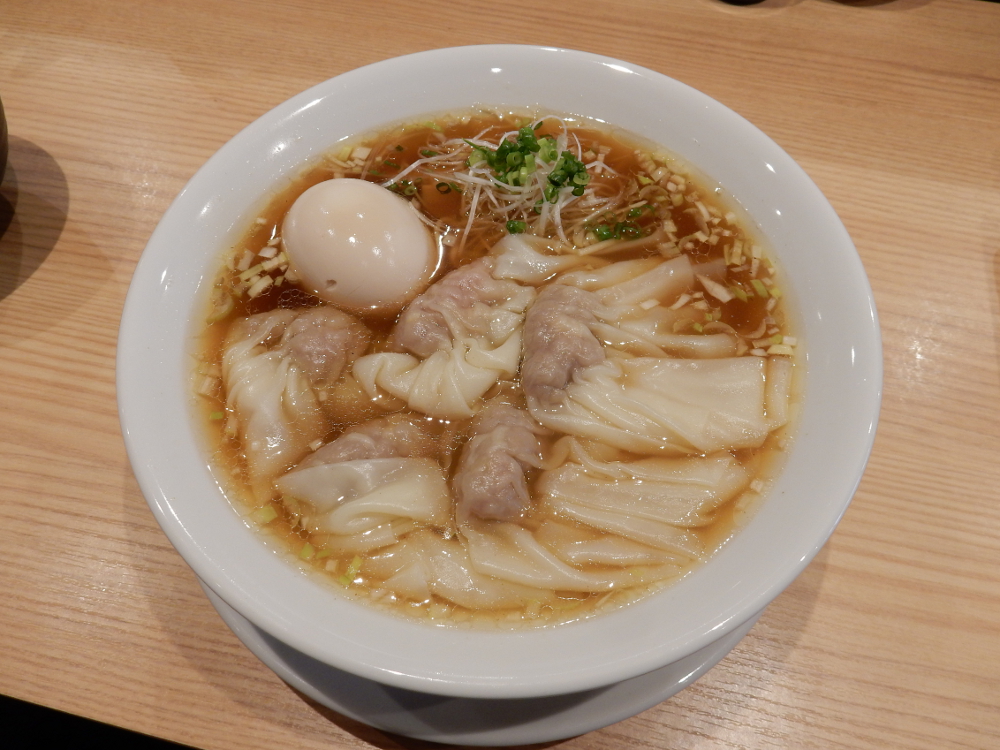ワンタン五個はそのまま麺に乗せてあるのだ。これじゃチャーシューそばにワンタン五個のトッピングということで注文したのに、完全に​ 定番のワンタンそば ​、チャーシュートッピングってことと同じだ。鶏魚介スープはあっさりしながらコクがあり、醤油タレとの相性も良い。平打ち中細麺はやはり茹で加減が柔らかい。餡がしっかり詰まっているワンタンはなかなかおいしくて、トッピングで頼む価値がかなり高いと思う。しかも改めて麺よりワンタンの存在感が強いと味わえた。