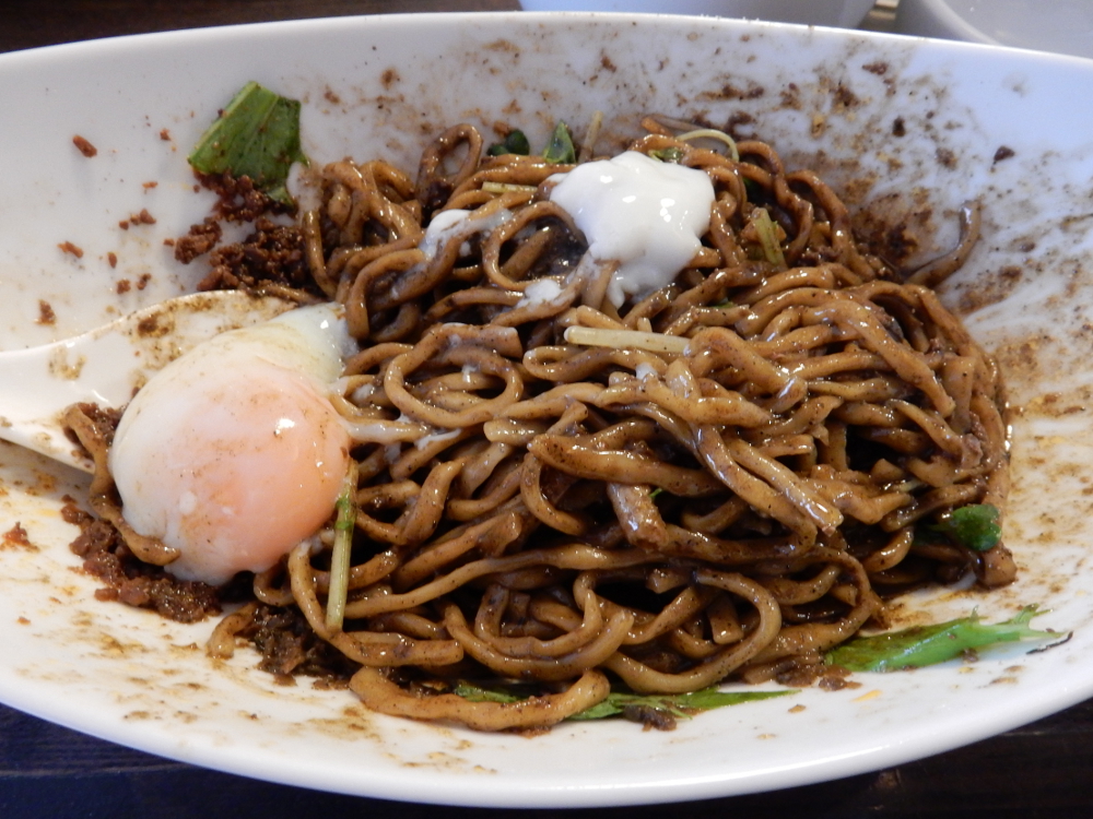 追加注文のトッピングは温玉だけで、しかも別皿での提供だが、通常の挽肉、水菜とパクチーなどの野菜はほぼ山盛りと言ってもよい。ラー油もやや多めだね。