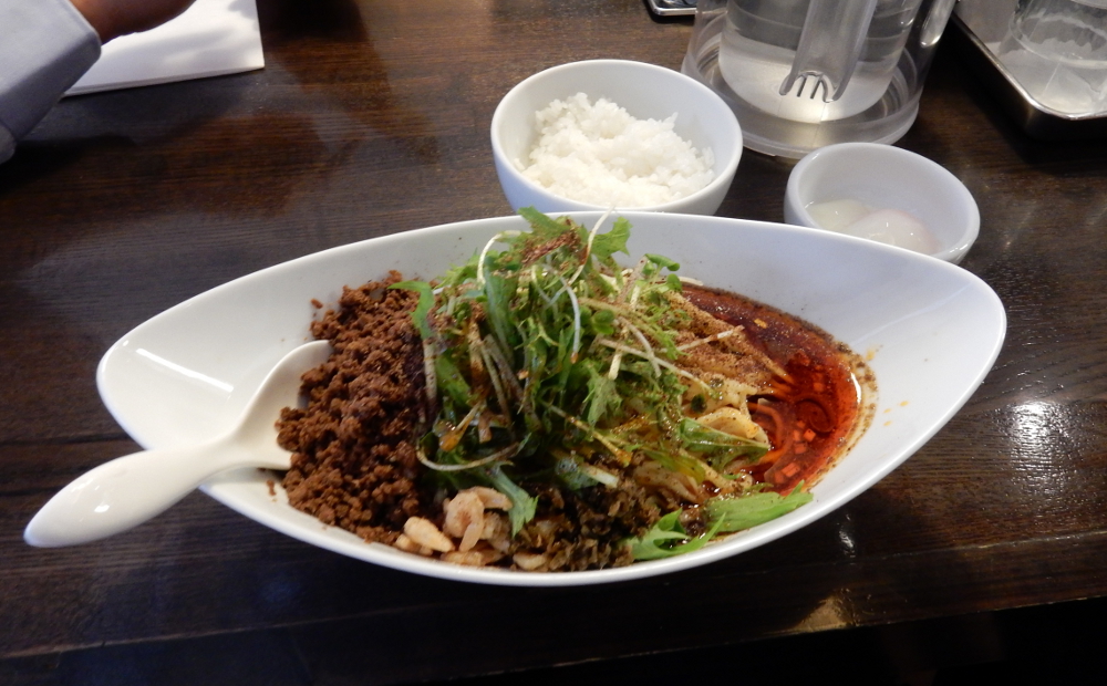 開店5分前に​ 二ヵ月以上ぶり ​の「​ 四川担担麺 阿吽 ​」に到着。今日はちょっと数分ほど遅れての開店。黒胡麻つゆ無し担担麺4・5辛、麺大盛、温泉玉子、ランチサービス・半ライスの食券を購入し、辛さと痺れを共に5でお願いした。