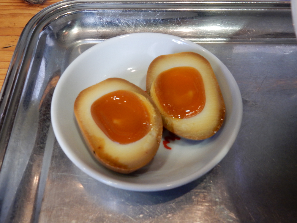 チャーシューの煮汁で味付けた味玉はタレの味が濃いめでおいしい。