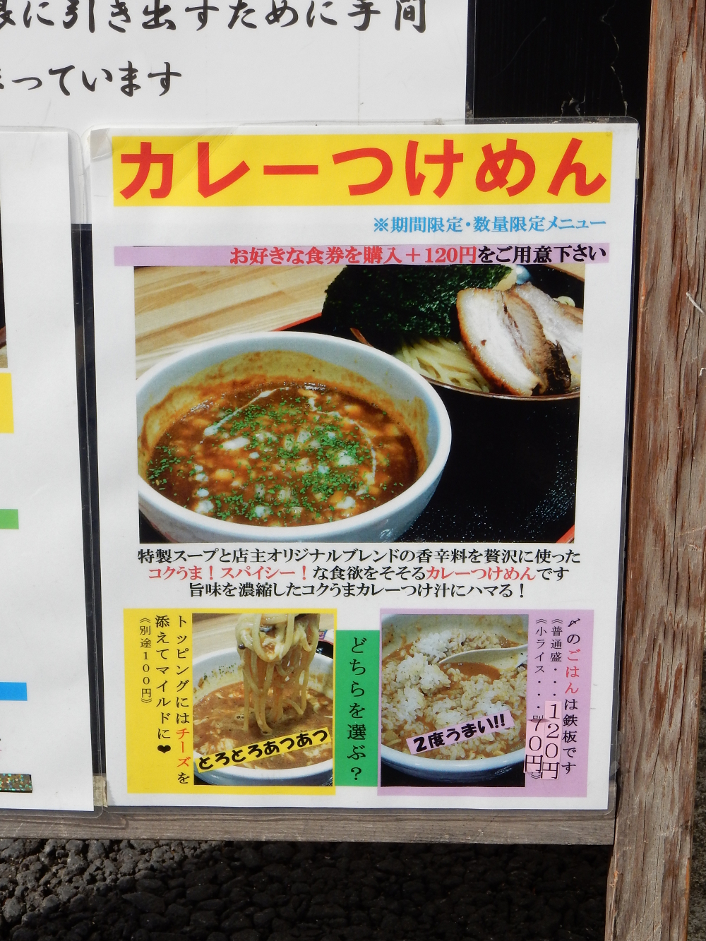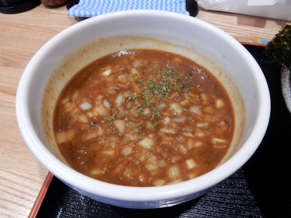 期間限定でカレーつけめんを提供しているね。通常のつけめんからグレードアップするということにもなるかな。特製つけめん中(300g)、ライスの食券を購入し、120円を月舘店主に渡し、カレーへグレードアップしてもらった。