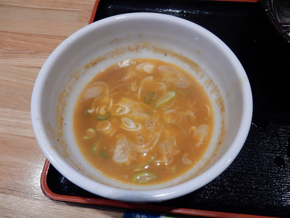 通常のつけ汁に比べ、味噌タレの濃度はかなりある。山椒と辛みは適度で、辛口に苦手な方もおいしくいただける辛さだ。