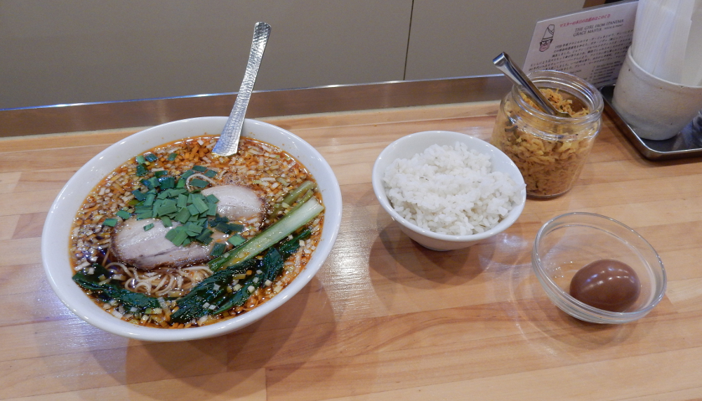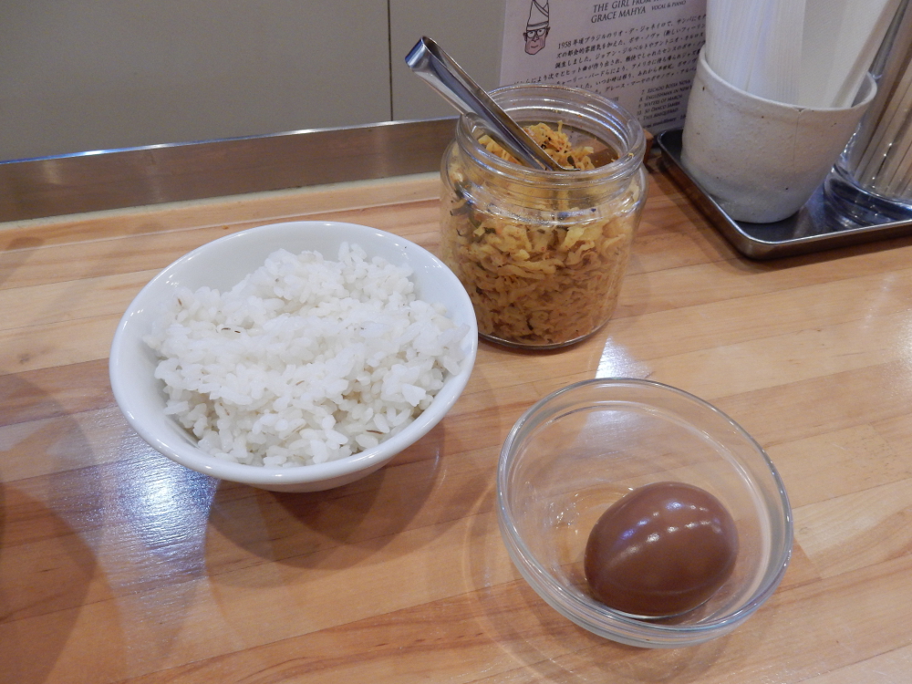 「​ 東京担々麺本舗 瀬佐味亭 ​」に入店し、裏酸辣麺のホット、麦ご飯を注文し、クーポンでほかほか煮込み茶玉子をお願いした。前回​ 裏酸辣麺 ​をいただいた時おいしかったので、ホットとの相性を食べてみたいのだ。