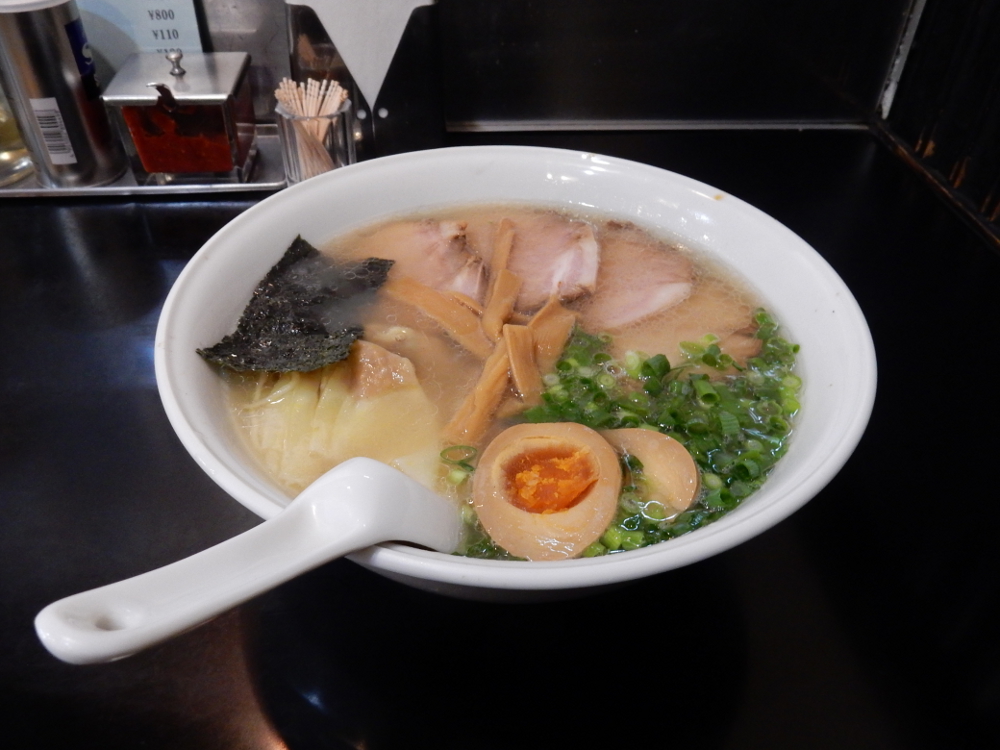 通常の麺より大きい丼だ。それもそうだね。ワンタンメンが有名な系統の中でこうや系の肉ワンタンはかなり大きいほうだ。通常のチャーシューよりさらに大きくて厚手の肩ロースチャーシューと豚バラチャーシューが載せてある。塩と醤油の中間と言われる豚骨ベースのスープは塩気がやや強いがコクがありなかなかおいしい。細麺は茹で加減が柔らかめだがスープとの相性が良い。醤蛋はこれまでの別皿ではなく、そのまま載せたのだ。