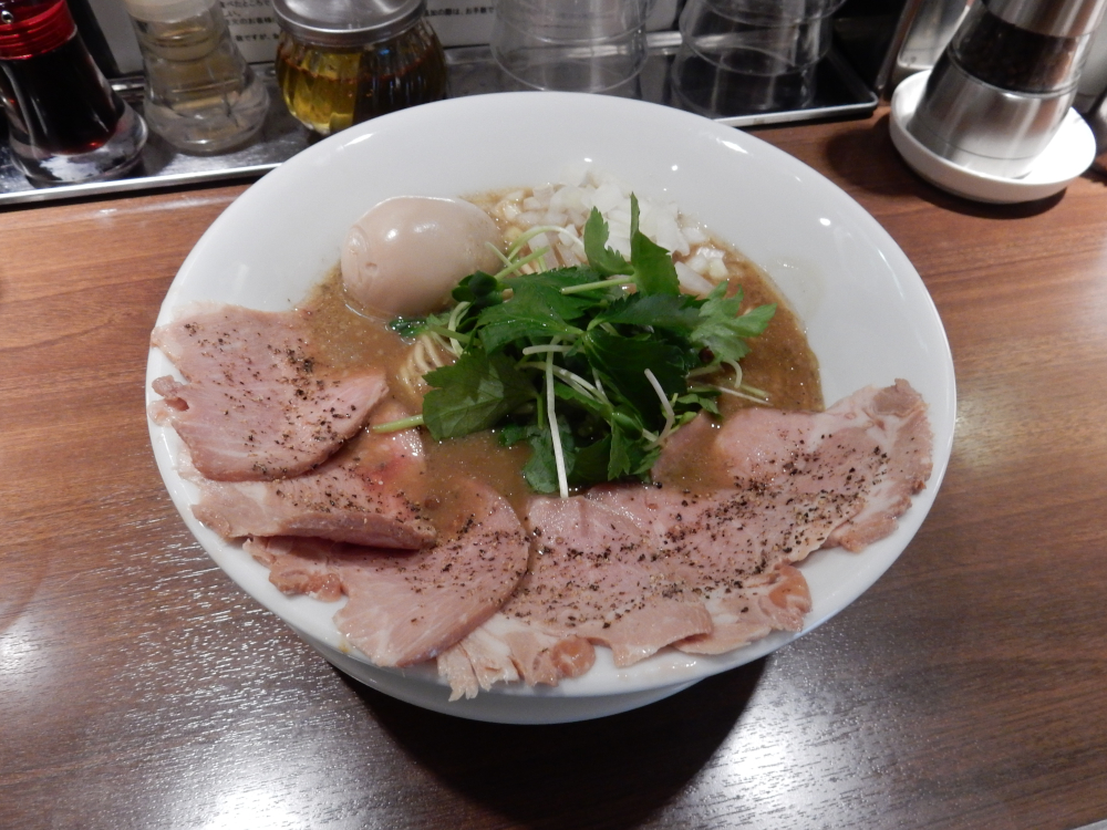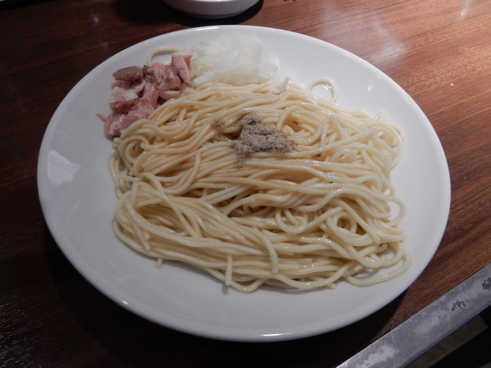 今日の胡椒は少し効いたが、スープのコクと甘味は相変わらずすごい。タマネギの酸味も少し胡椒の効き目を緩和してくれた。中太ストレート麺は歯切れと絡めがよく、スープとの相性が良い。レアチャーも相変わらずうまい。やはりここに来たらチャーシューのトッピング注文が必要かな。