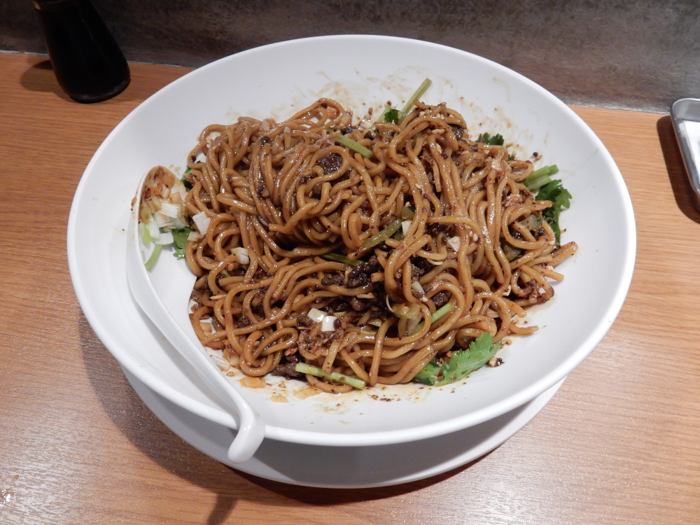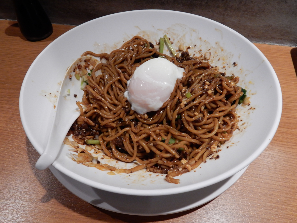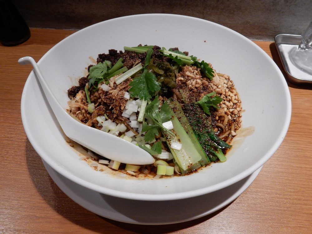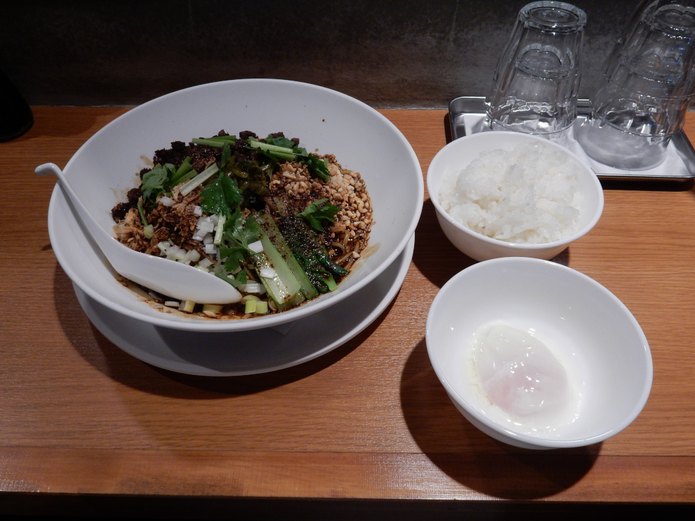 ​ 人形町のお店 ​と同じ二階にあるが、店への手段はエレベーターしかないようだ。ただし人形町の広いお店に比べ、ここはカウンター席のみ。気になる汁なし担担麺成都担担麺、温泉卵、麺増し、ライスの食券を購入し、辛さと痺れを共に強めをお願いした。