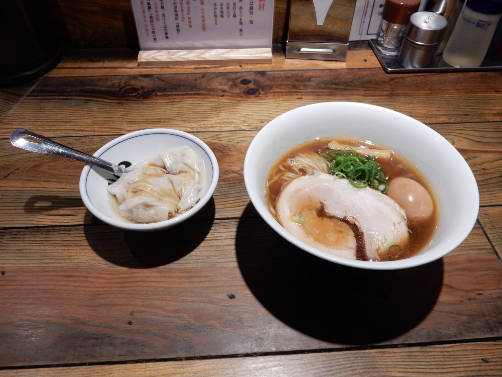 すぐ入れる「​ 松戸中華そば 富田食堂 ​」に入店し、半熟味玉そば、純粋金華豚ワンタンの食券を購入してからスタッフに渡し、醤油をお願いした。ワンタンは別皿での提供がお勧めだということで、別皿でお願いした。富田食堂には​ 半年ぐらいぶり ​だったが、レギュラーの中華そばは​ 1年ほどぶり ​だった。