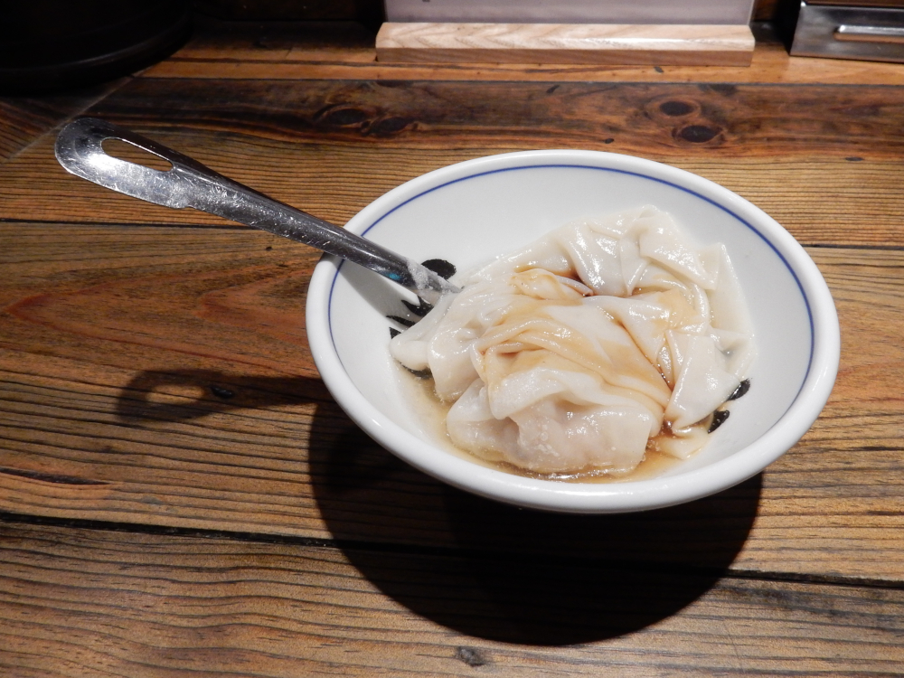 ワンタンに薄い醤油出汁がかけてある。皮は薄いもののもちもちしているので、少し時間がたっても破れていない。