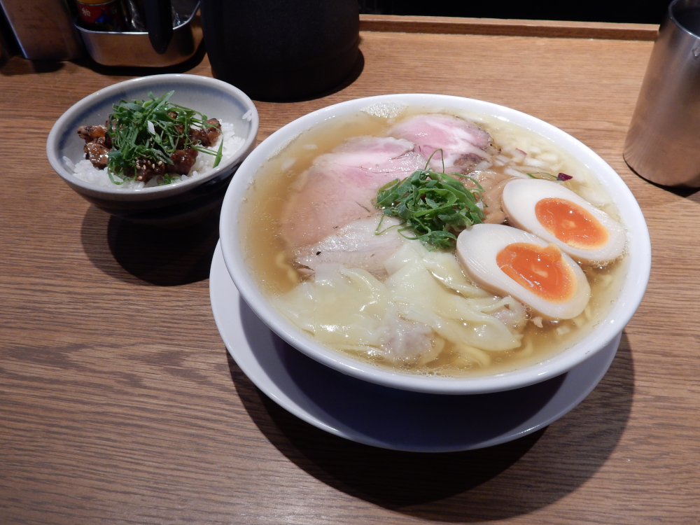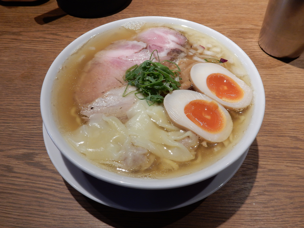 麺が勝ったと思われそうなスープは白醤油使用で、あっさりしながらコクがある魚介味だ。うまみがじんわりと口の中で溢れたのだ。個人的にもっちりした手もみ中太麺はスープと合っている。ワンタンは皮がもちもちして、肉も詰まっている。肩ロースのチャーシューは固さがちょうどよく、味付けもよい。バラチャーシューは油っぽくなく、歯切れもよい。