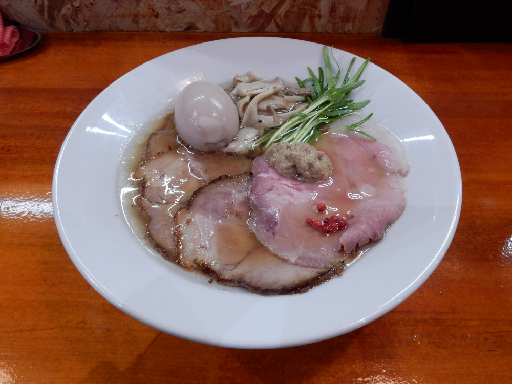 ポルチーニとはキノコの一種だという。ポルチーニだけではなく、ソースもいたいなものも載せてある。店のチラシによれば、それはポルチーニのペーストで、ピンク色の粒はピンクペッパーだという。スープは豚と鶏清湯によるもので、甘味が結構まろやかで醤油タレとの相性が良い。中細ストレート麺は平で、絡めもよく、もちもちしておいしい。途中でペーストをスープに溶かしたら、一気にポルチーニのコクが強まった味になった。レアチャーシューは歯切れもよいし大きい。チャーシューをトッピングで増量してよかったのだ。