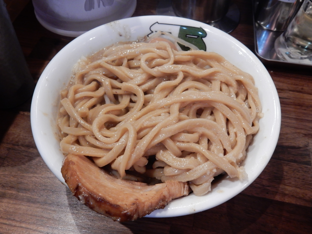 もちろん天地返しだね。幅が広い平打ち太麺は絡めが良くて、歯切れが良いぐらいで茹で加減が柔らかい。昔のようなもっと弾力が良い麺は好みだけど。スープはタレと出汁の濃度がともに高くて、多めのニンニクおよび野菜との相性が良いが、松戸駅東口店と昔の味に比べ、少しマイルドの濃度だ。それでも十分にこってりしておいしい。