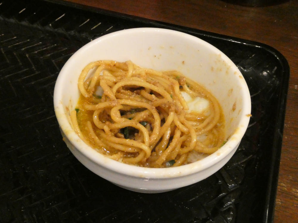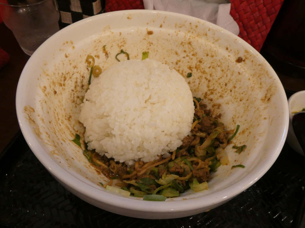 残りの温玉をかけ、山椒とガーリックパウダーをさらに投入し、完食。