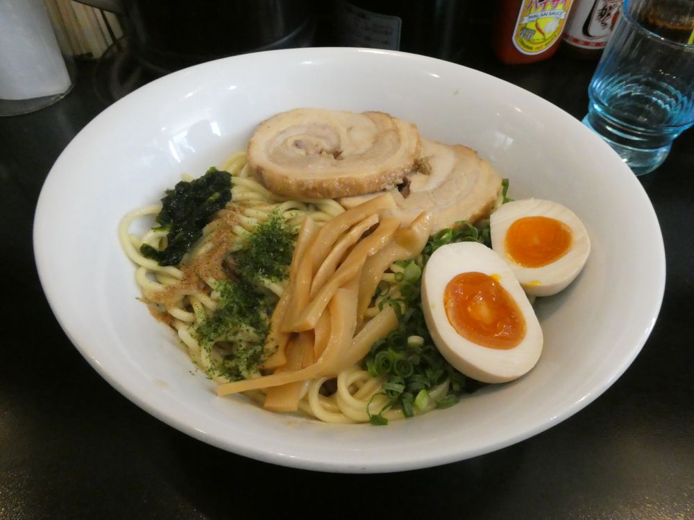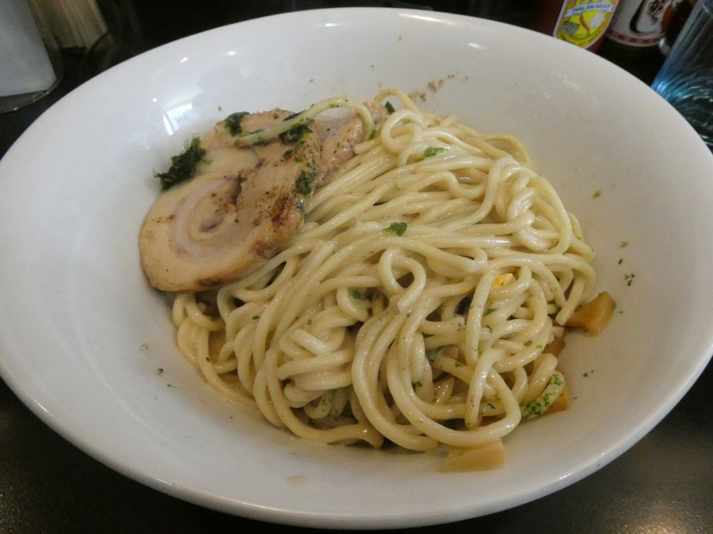 クリーミーなタレは相変わらず洋風っぽい味で、塩気がそんなに強くないがうま味が十分。肝心な中太麺はもっちりしておいしい。味が落ちたと指摘した方もいるが、短時間でこのようなレベルの自家製麺を提供することができた新店主に感服しなくてはならないと思う。途中にフライドガーリック、ラー油、泡盛で作った島とうがらしをさらに投入。島とうがらしを入れすぎると、泡盛の味が強すぎるが、ラー油も、島とうがらしも基本的に辛さがわしにとって控え目だ。