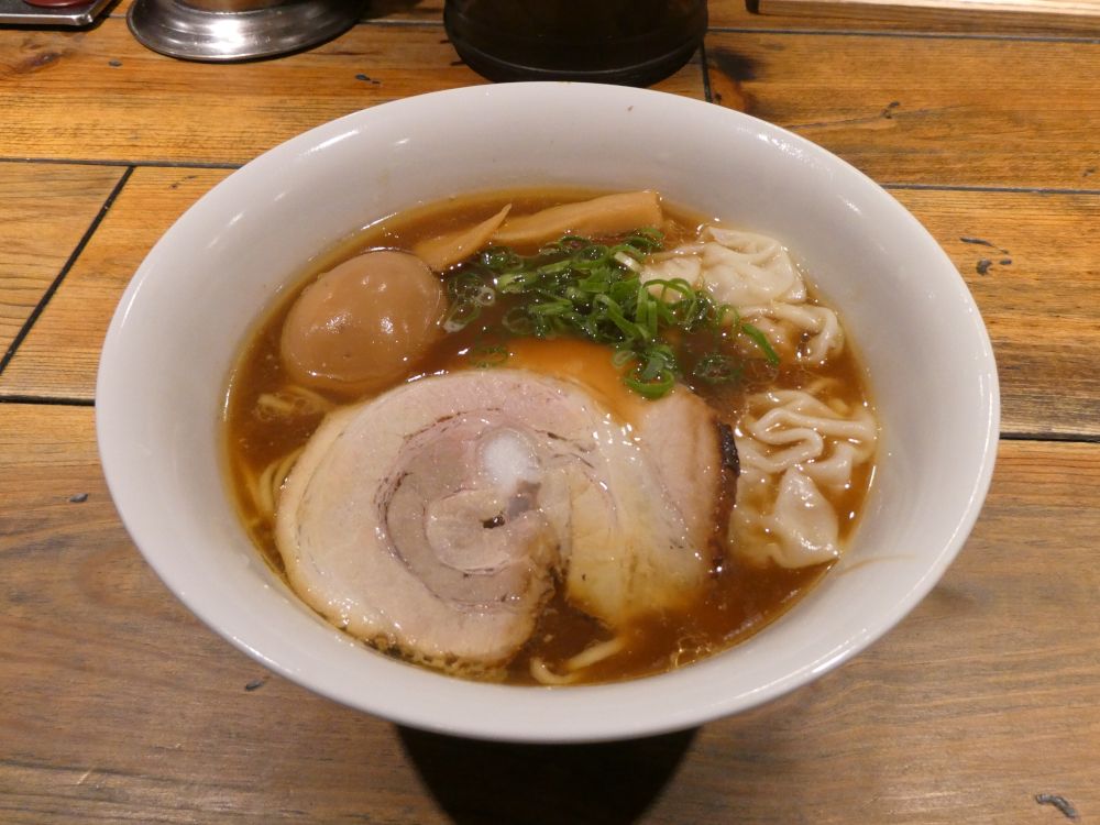 しばらく待ったら、​ 半年以上ぶり ​の麺が登場。定番のそばのスープは鶏ベースで、出汁とタレの濃度が高いし、鶏油も効いている。平らな細麺は絡めと歯ごたえがよい。量がやや少なめだが、この時間帯ならちょうどいいかな。ワンタンも肉がおいしいし、皮がもちもちしている。炙りロールチャーシューは歯切れがよいし、香ばしい。