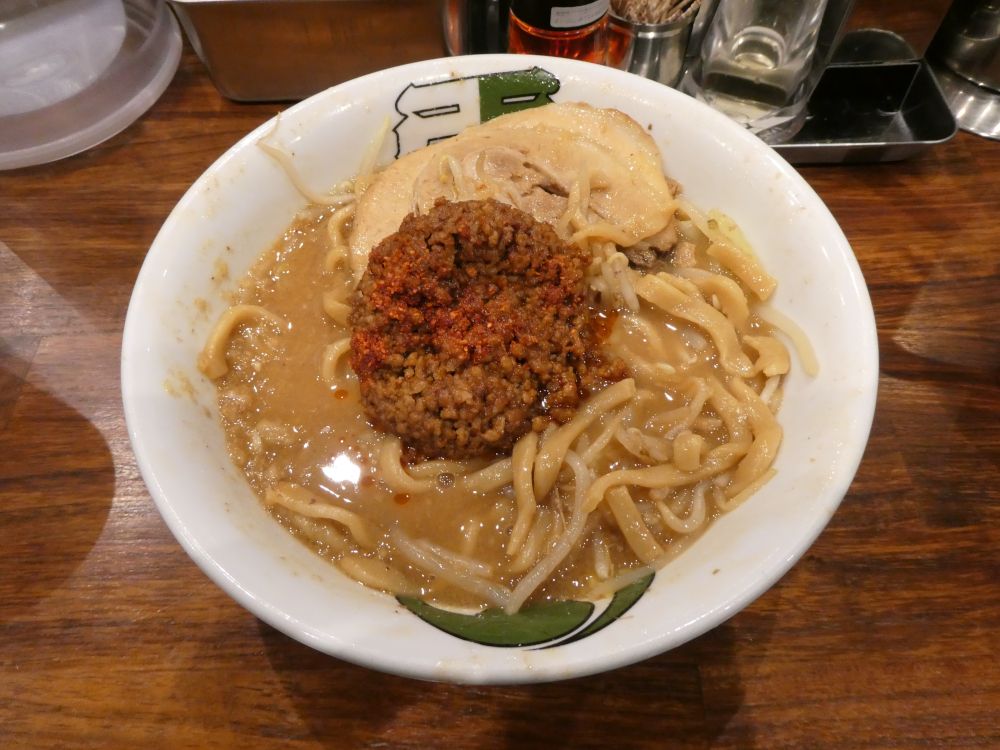 途中に辛味を投入。わしにとって辛くないが、肉味噌とスープ、麺の相性が良い。