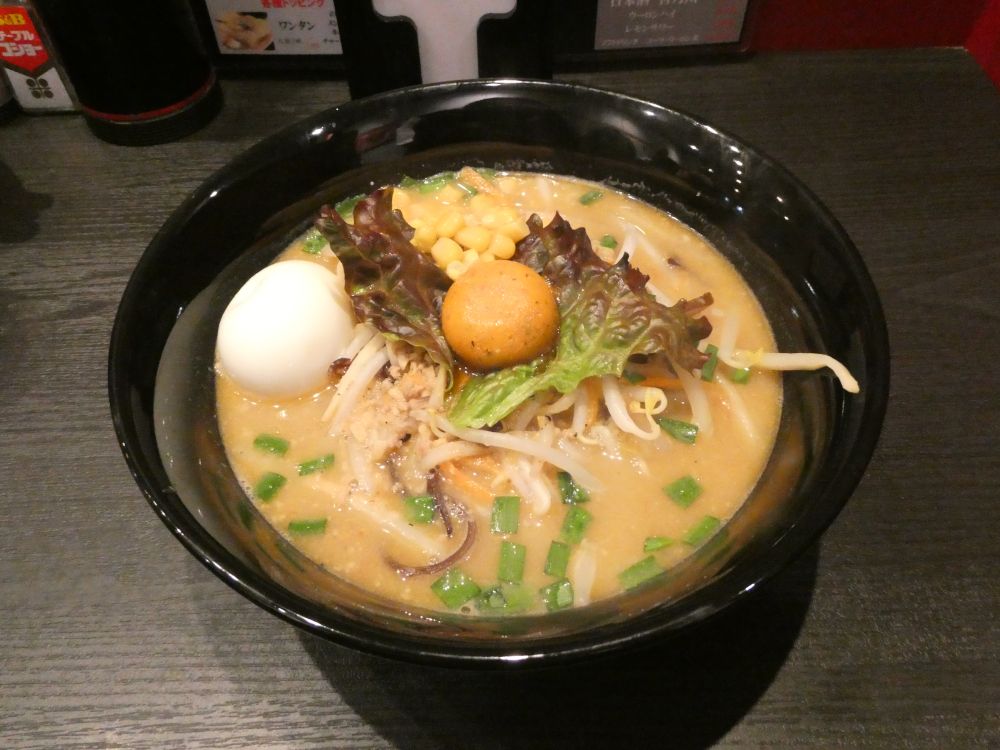 去年と同じ仕様で、味噌が甘味がしっかりしている。わしにとってあまり辛くないが、辛味噌を溶かしながら食べると、味の変化が楽しめたのだ。通常の麺と違った平打ち縮れ中太麺は絡めもよいしコシもある。肉がやや少ないが野菜が多いので健康的だ。