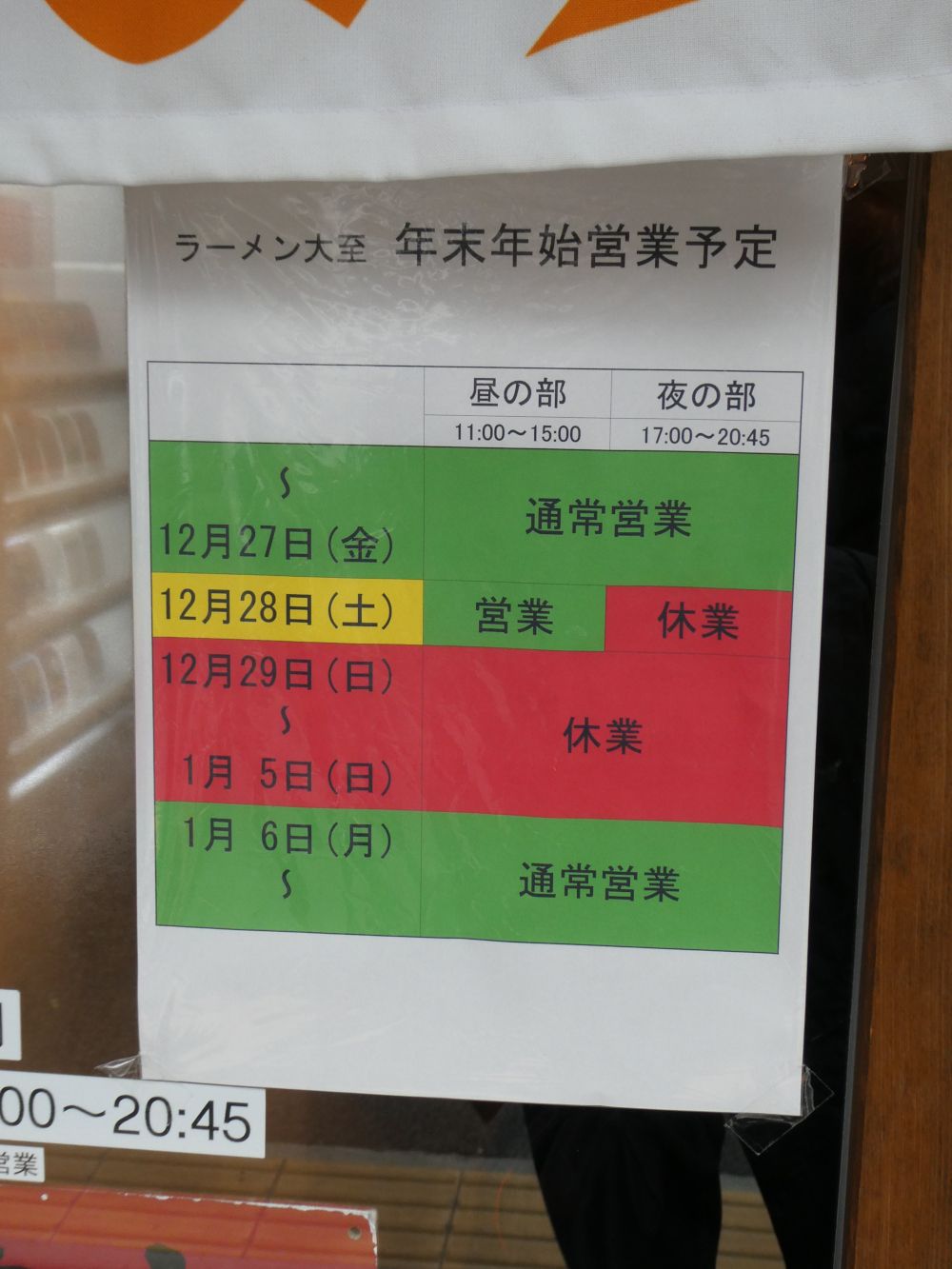 「​ ラーメン 大至 ​」のフェースブックページを確認したら、​ 辛味噌 ​の提供が始まったことが分かった。年内なら今日しか行けないのでゴー。