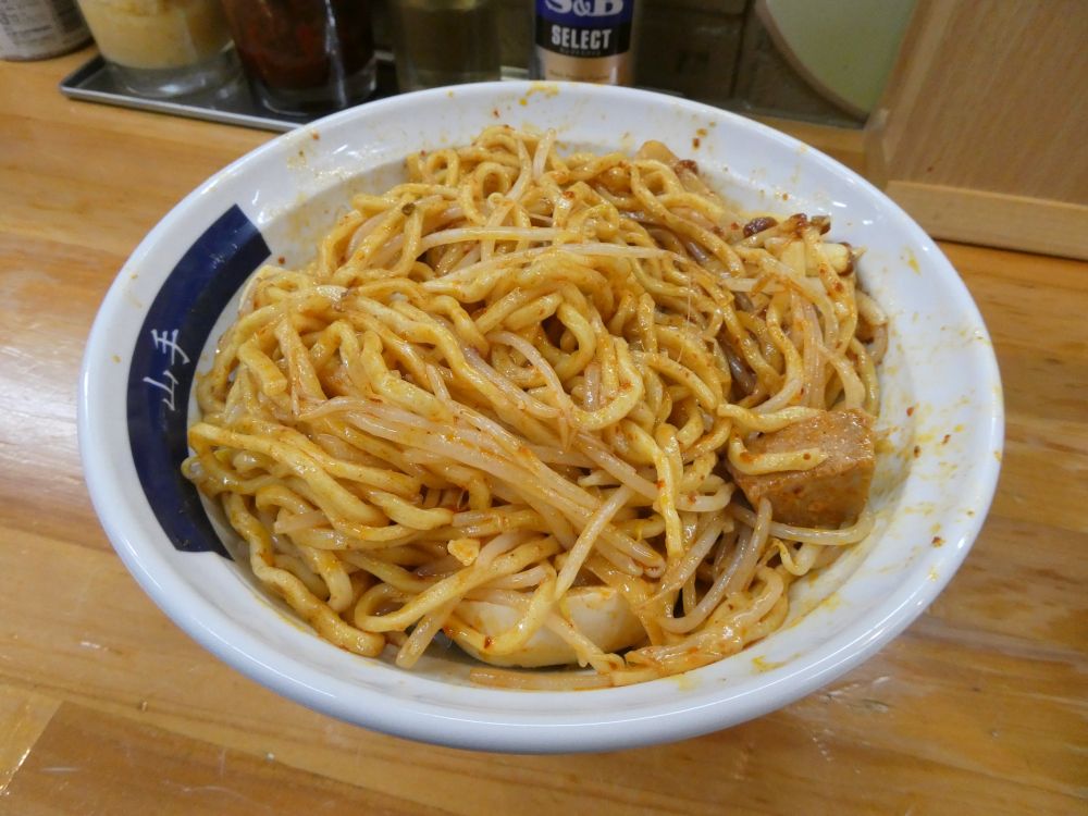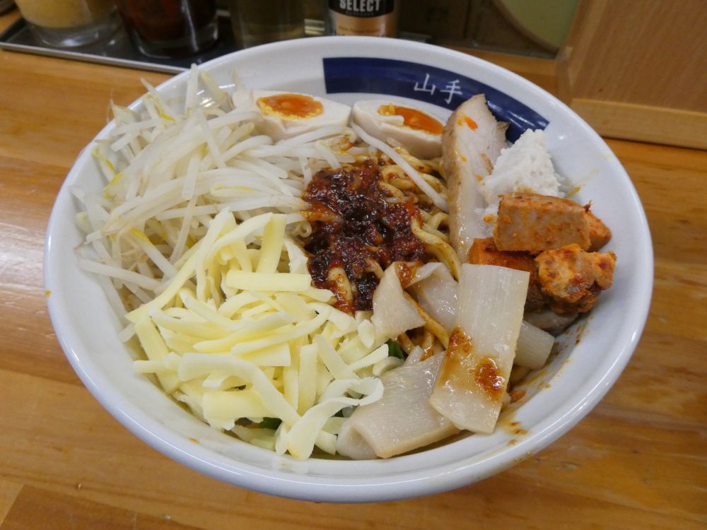 茹で加減がカタメで、パスタのような食感の中太麺は絡めもよいし、コシもある。タレは辛口のようだが、わしにとって辛くない。途中にニンニクとラー油をさらに投入。チーズと脂はタレの味をさらにまろやかにしたのだ。