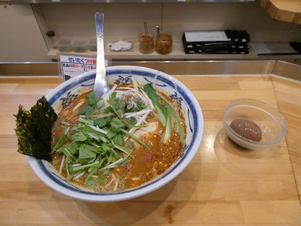 「​ 東京担々麺本舗 瀬佐味亭 ​」に入店した。今年の初訪問だ。金の担担麺のスーパーホットを注文し、クーポンでほかほか煮込み茶玉子をお願いした。