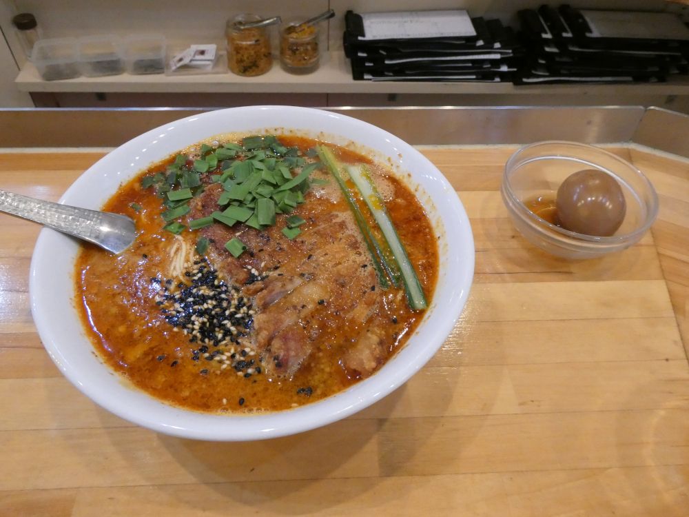 「​ 東京担々麺本舗 瀬佐味亭 ​」に入店し、パーコー担担麺のスーパーホットを注文し、クーポンでほかほか煮込み茶玉子をお願いした。