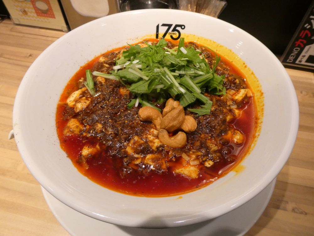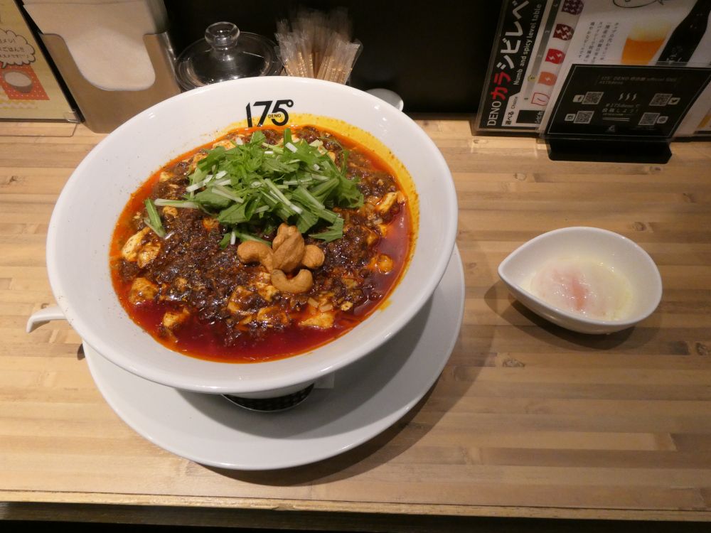 職場に入る前にブランチを。元々時差出勤なので、ランチタイムの時職場周辺に到着することが多い。辛い物を食べたいので、​ 3ヵ月ほどぶり ​の「​ 175°DENO担担麺 本郷三丁目店 ​」に入店。汁なしを食おうと思ったが、食券機に貼ってある期間限定の麻婆麺の告知を見て、惹かれてしまった。麻婆麺、温泉玉子、小ごはんの食券を購入し、すごく痺れる、辛さマシをお願いした。しかし、ごはんは米炊きの失敗で提供できる状態ではないということでスタッフから返金された。