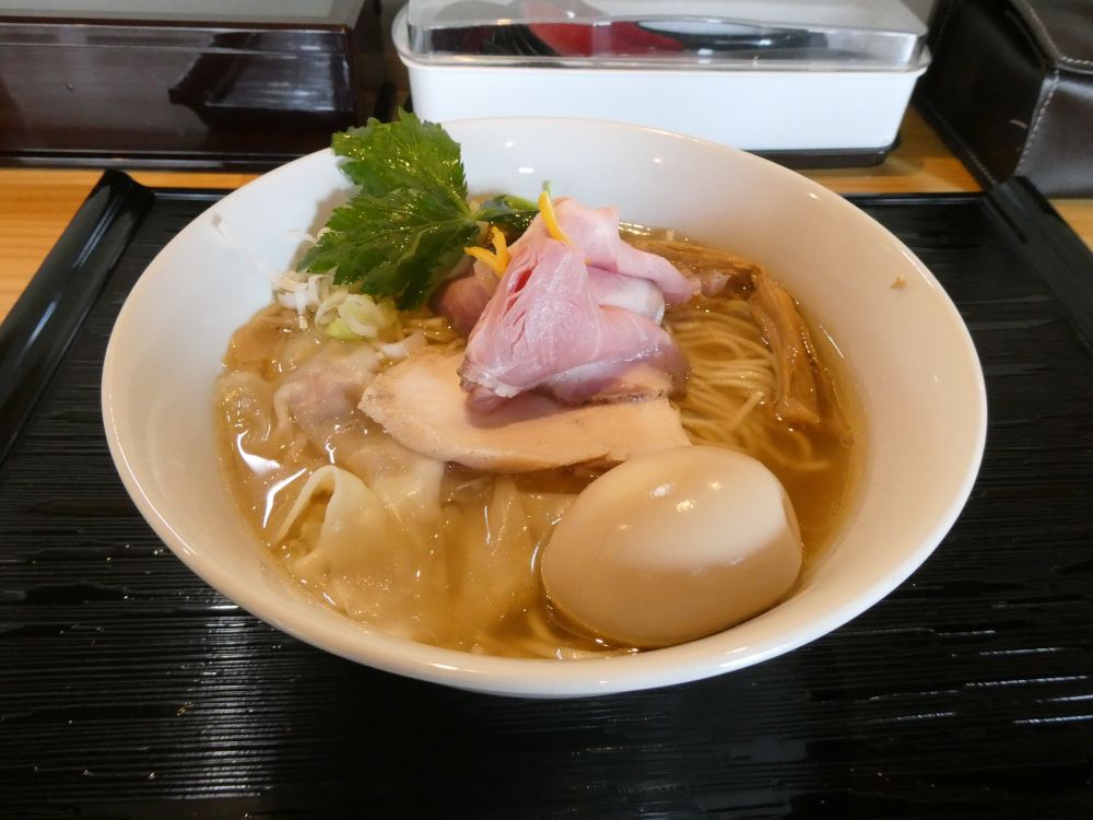 鶏魚介スープは一瞬に魚介による塩気がやや強く味わえたが、基本的にまろやかなで、バランスがよいのだ。柚子もアクセント。中細麺は絡めと歯切れもよいし、、ボリュームも結構ある。チャーシューはスライスレアチャーシューと鶏チャーシューが入っている。皮が厚いワンタンは肉が小さいが皮がもちもちした。